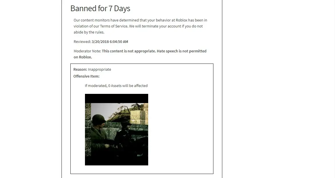 I will provide some of the full pictures of those rejected by Roblox, and the latest one that gave me a 7 day ban for, I assume a misunderstanding.