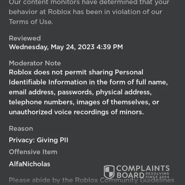 Hello there, I am Nick and my Roblox account was terminated on 24th of may 2023 for false charges of privacy and I have been accused of giving my PII (Personal Identifiable Information) and the offensive item is "AlfaNicholas". Now please not that "AlfaNicholas" is my Roblox username and not my PII. I have tried raising multiple appeals and sending multiple emails to Roblox Support but I have not received any useful response other than the automated message please kindly look into this problem and try to fix it at the earliest. For further assistance please contact me via email, my email is "[protected]@gmail.com"