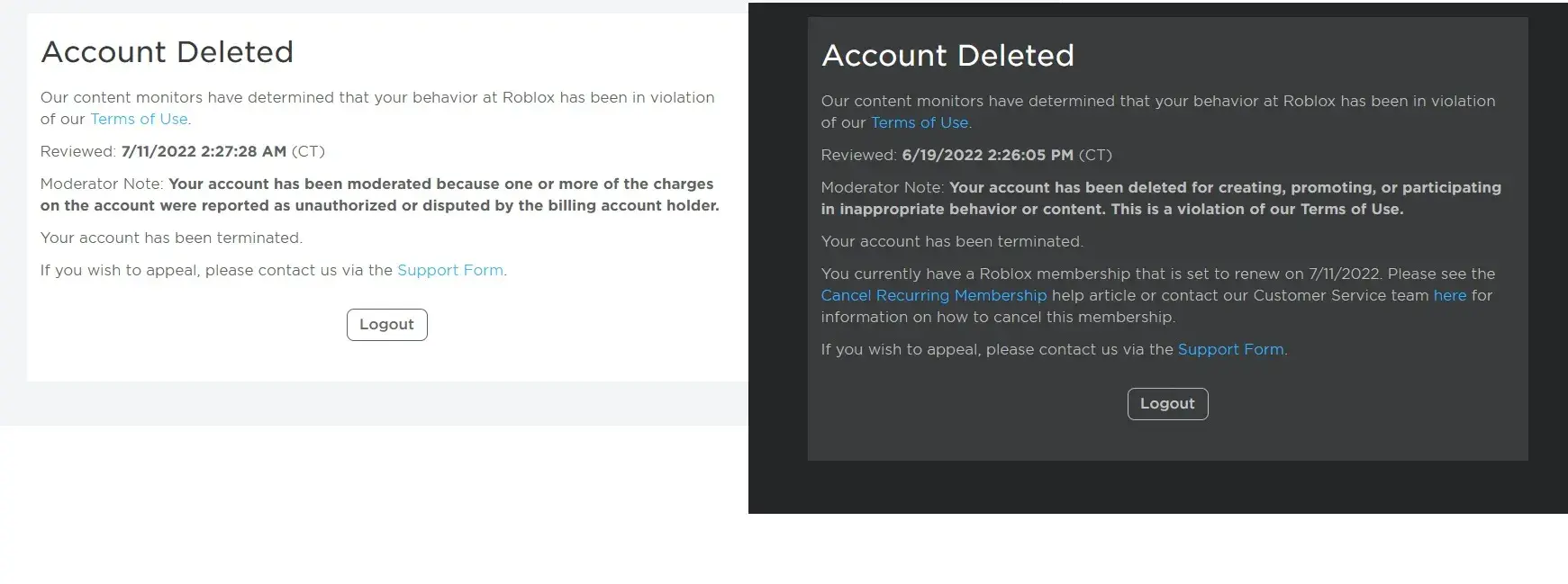 I've asked them how can we can cancel the VIP membership due to the termination (could'nt do it via the site) and they never responded (automated responses only), so I had to cancel it through paypal and claim the current month's money back. Then, they terminated my other son's account. Really? The game is for kids. They are sensitive and investing big time and energy and for what? Roblox staff's lack of empathy is gross.