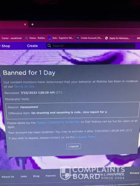 My friend, user sandramccrmck4 was banned for telling someone who called her fat n a monkey and was also assuming stuff that she was gonna report them, and hundreds of thousands of people are getting banned from the Kohls admin thing as well, This is basically what happened, they were playing murder mystery 2 and someone was fat shaming and assuming stuff my friend literally typed ''Fat shaming and assuming? nice report for u.'' and it even says that on her ban report n she got banned for a day for apparently harassing them? How,
