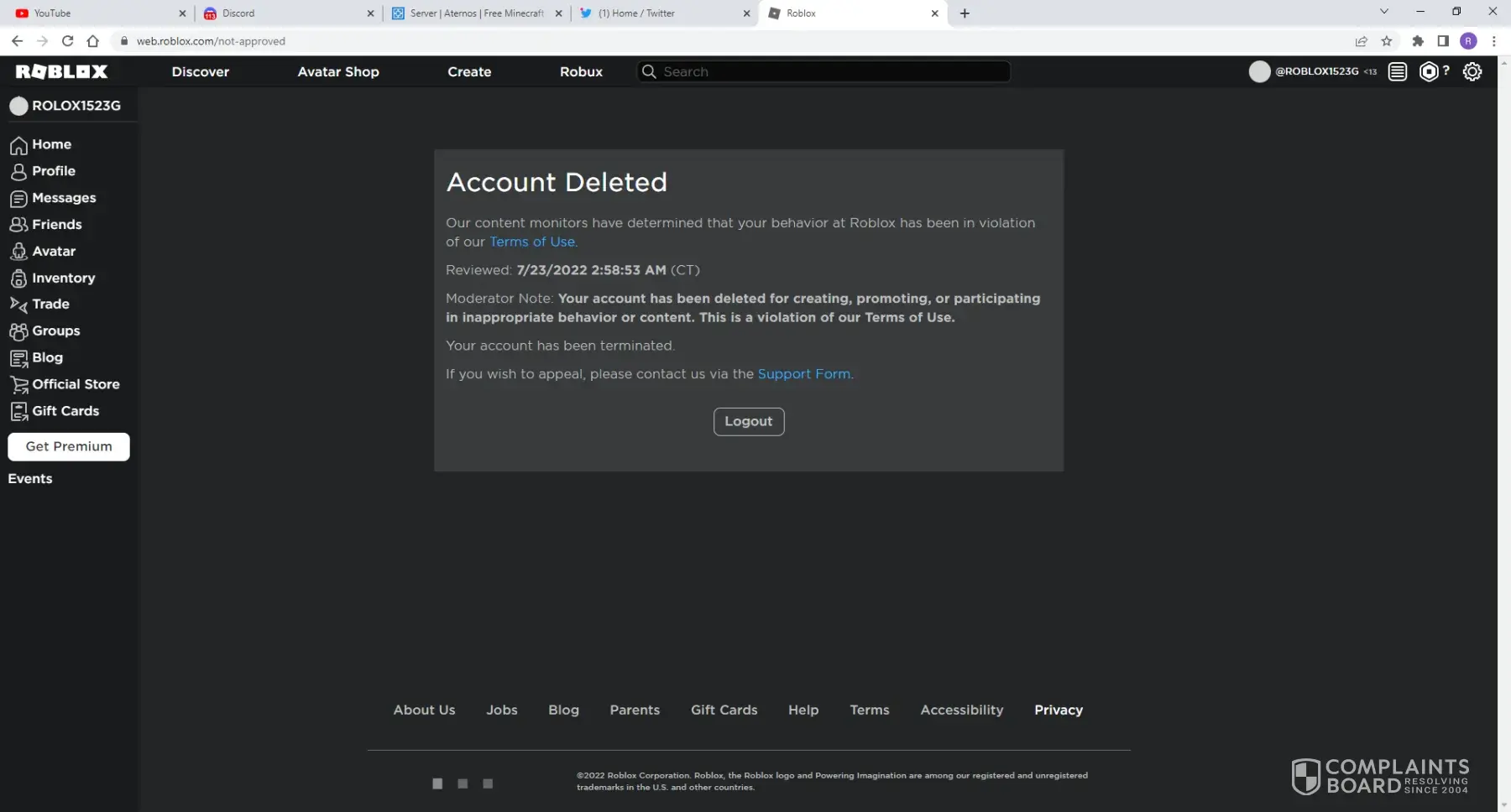 Desired outcome: I would love a apology from Roblox and I expect to not get banned again for something I don't remember doing and I hope to never have to complain again.
