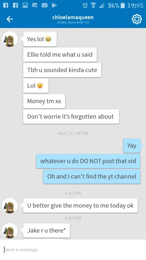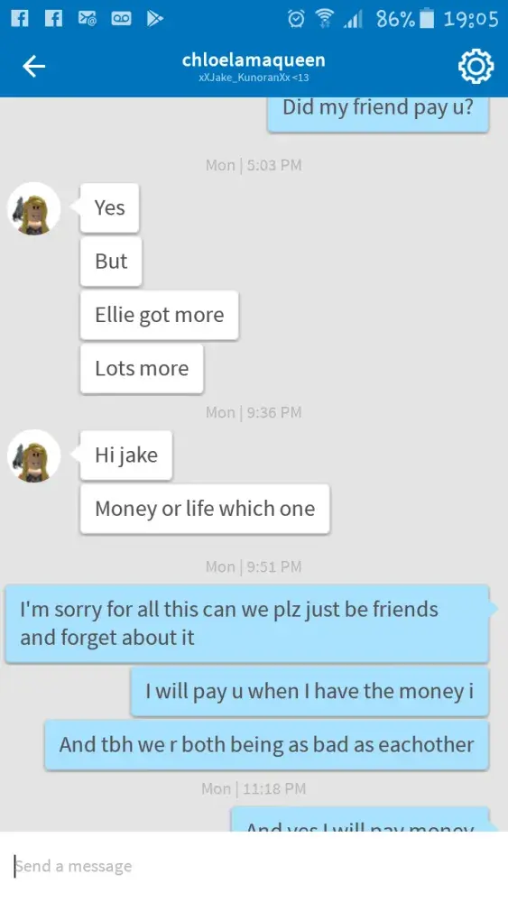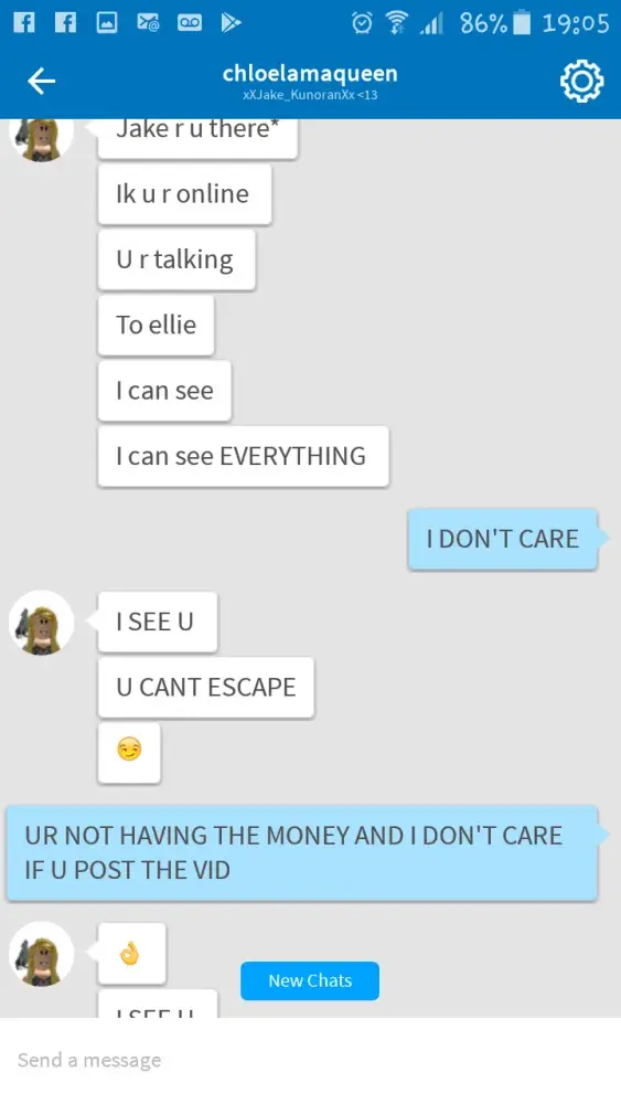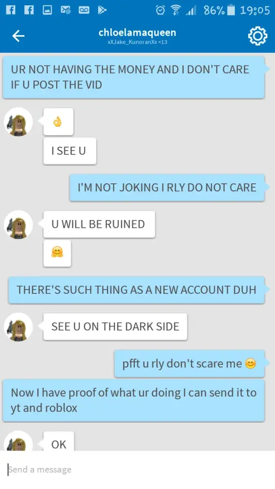 Right my child has been playing roblox slot and enjoys the game until recently a girl sending him threats and demanding 50, 000 in roblox money. I will not tolerate this behaviour at all and suggest you do something about this asap as yet again your game is proving to be unsafe to play when now children like my son is being threatened. I want someone to reply to me asap or I will be taking this further