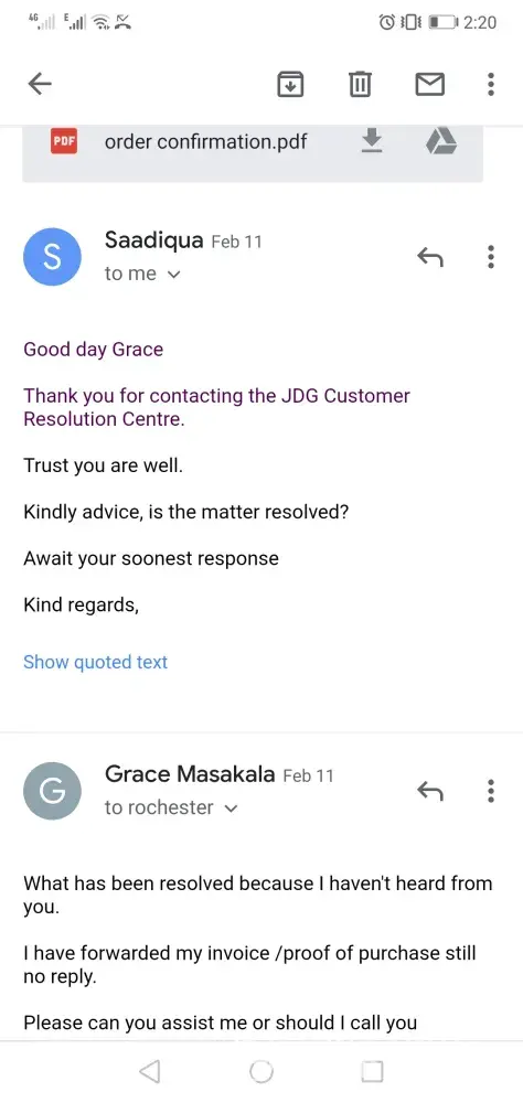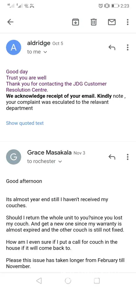 I bought couches on account from Rochester, my 3 seater recliner couch broke during lockdown. I reported it, they came and fetched it in October. It is the 23rd of February and I still do not have my couches. I have phoned numerous times, they sometimes say they will arrange for the pick up of my couches and then are surprised to hear that they have already picked up my couches and I am waiting for delivery. I was promised delivery on the 6th of February, they said the driver will phone me about an hour before delivery. Nobody phoned me on the 6th of February. I have complained online, I have complained on their Facebook page and still nothing, all I get are promises that "someone" will be in touch with me shortly. I have phoned again today (23 Feb 2021) and was promised delivery on the 27th of Feb, again told the driver would phone me an hour before delivery. When I asked for some kind of guarantee that this would indeed happen, I was told they can't give me one. When asking to speak to a manager, said manager responded saying he cannot take my call as he has other things to do and I should just send him an e-mail. His name is Sameer Fakir. Still no couches, still no guarantee that my couches will in fact be delivered as promised.