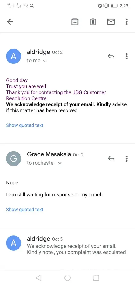 Worst company to deal with, biggest regret ever to have bought a coach from them. First I bought a new couch which I discovered that it is not new because it was sluggish on the day bed side. I called rochester to report this in september 2020 everytime they would tell me they will call to arrange for collection but they wouldn't instead i'll get a call from the driver telling me they on the way, like wtf? Eventually in february 2021 they came to collect the couch and no feedback has been communicated to me, I have no idea what is happening and when am I getting back my couch. When you call their service line it rings then cuts off.. I want my couch back please! Just give me my couch which I paid for and we'll never have to deal with each other ever again am done with such nonsense service