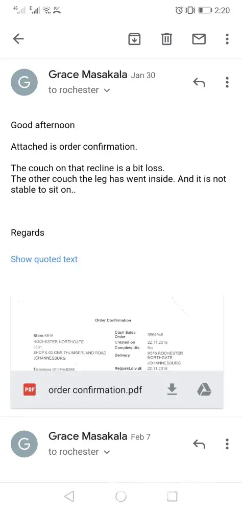 Please note that in the meantime we sold our current lounge suit after payment to Rochester and during the weekend we had visitors which had to opt to sitting outside as we had no lounge suite as Rochester promised us that delivery would take place on Friday 04/12/20.