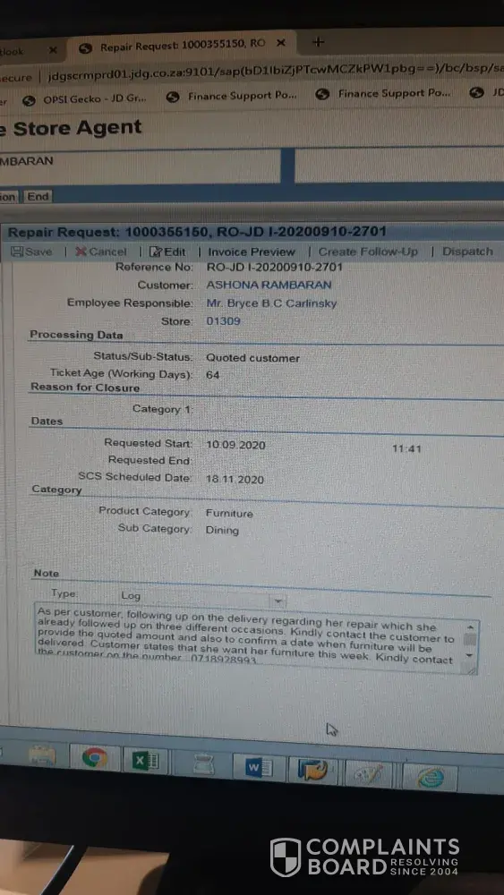 I have made a special layby order on the 05.09.2020 and I was assisted by Nkosana and he was extremely helpful at that time and he confirmed that on the next following Tuesday he will place an order and they will start making it and by the time I pay it up it will be ready to be delivered. I did promised him that I will settle my couch on the 20th of September and he said I will get it at the time. I did not settle the account in that September because of health reason due to being admitted in hospital however I did trf the outstanding balance of R10 800 on the 20th October 2020.