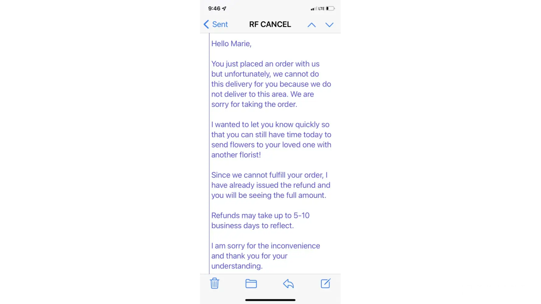 Same thing happened to me. I have tried to communicate with them and have have not been able to. I ordered flowers after my grand daughter had surgery and received the exact same email with NO refund.