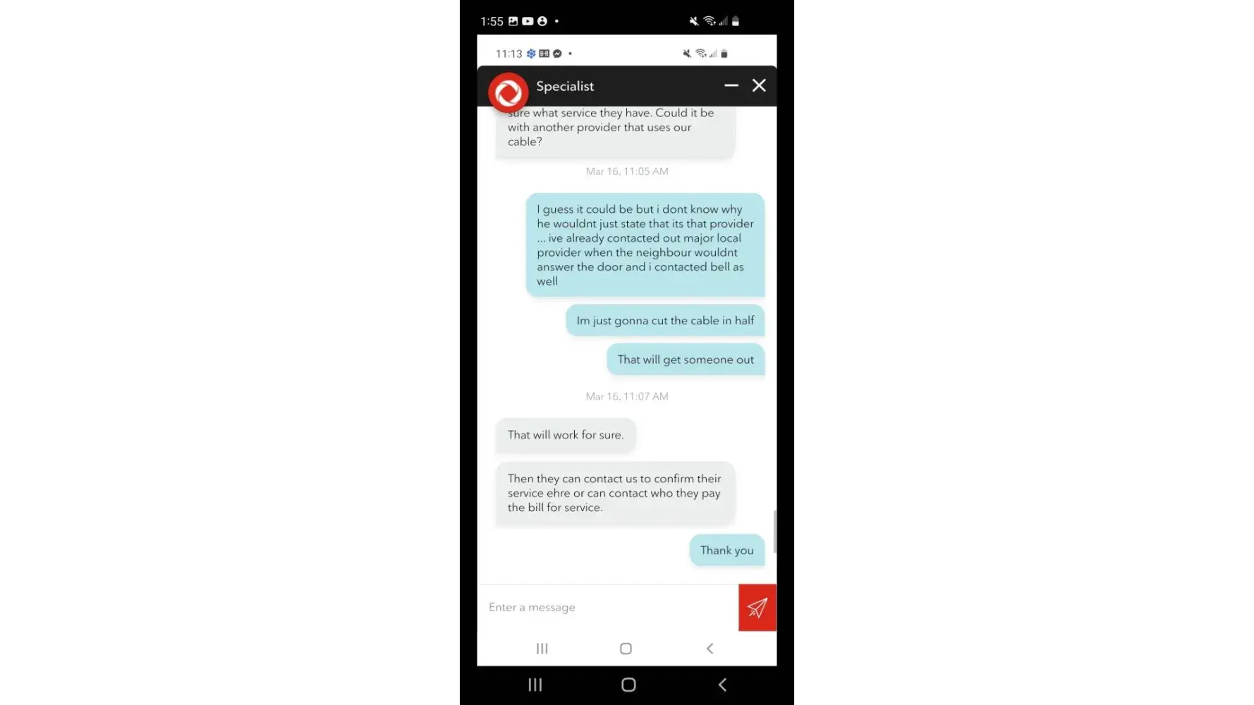 I had some wires hanging through my backyard belonging to my neighbour running directly from his house to the back corner of my property. These are hazards with children that live here. I contacted my neighbour to address this who told me he had rodgers internet. A month later still no resolution so I contact rodgers directly myself. I from here get a response that there is no rodgers internet at this address... Basically calling my neighbour a lier... I tried to have the city fix this issue and no luck.. Perhaps I should have gone the media route... Anyways... I figured if I told your agent I would just cut the line in half that would perhaps get the agent to budge... He told me to go ahead... Which I might add if I was mistaken and this was a hydro line your agent would have instructed me to basically kill myself... Here I am a week later after being instructed by a rodgers agent to cut this line that is not a rodgers line... And who do I see repairing the line... A rodgers van is here go figure... [protected]@gmail.com