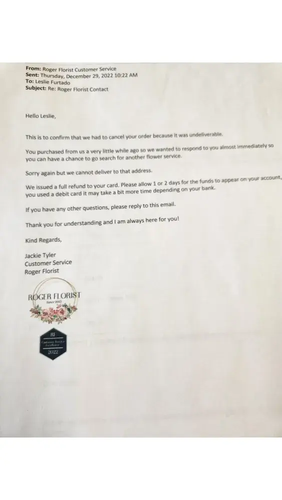 1-9-22 paid $70 for flowers to be delivered to my mom in Florida for her bday. Got an email that it was undeliverable and that I would receive a refund. Haven't gotten a refund and never will!
