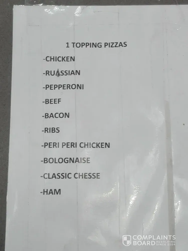 Went to Romanz and the advertisement says that you pay R99 for ANY 2 LARGE PIZZAS. Walked in and we ask, then they showed us a paper that is all scruffy just stuck to to the counter with tape that only has toppings to choose from to put on your pizza. On the 2 large pizza sign in very fine print after walking basically nearly against the sign it says in fine print only one topping. That is unacceptable. The advertisement on the TV says nothing about the one topping only on the pizza. So both is basically wrong advertising. They can definitely shut down Romanz by highland mews and then the worker is rude to us as well to say that we must read the fine print but that's the advertiser's work to make the text bigger so anyone who walks in can see it clearly.
