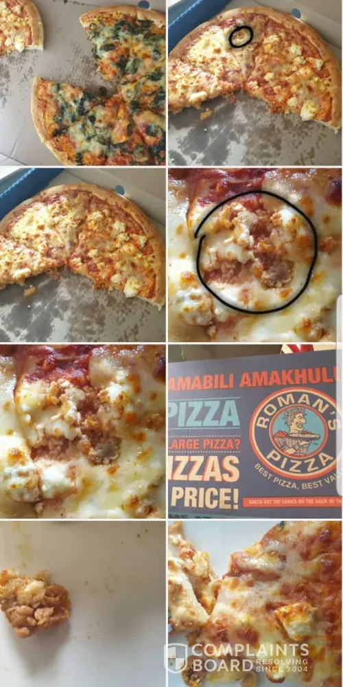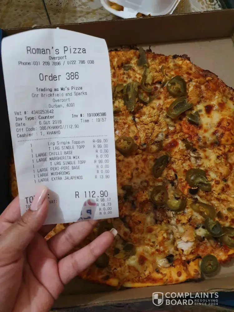 I ordered the 2 for R99 deal and since its fasting and we can only eat veg, that's what I opted for. Went to the Roman's pizza in Overport. My pizza has chicken on it when I asked for mushrooms. And nowhere on the order does it say chicken. I am very disappointed as no one will be able to eat that pizza and will have to be thrown away. That is money wasted and so unprofessional as it is a prayer week and to then see the chicken on the pizza was a huge turn off. Tried to phone them which was around 8:45 and it says that they are closed, but if you Google them it says they close at 9pm. Very disappointed with this service.