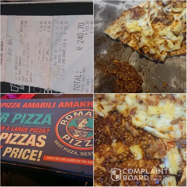 I just ordered romans pizza at bank city johannesburg chicken mayo (bacon) i am very disappointed as everything was burnt the becon was burnt the the base was burnt even the mozzarella did not taste so good i would appreciate it if this matter could be attended to as soon as possible and i am given feedback as per the complaint from manangement please assist