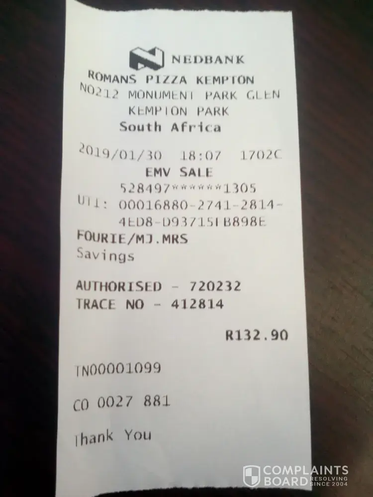 With regard to the above mentioned complaint on the 13th of June at the Romans pizza paddocks branch I was highly disgusted at the level at which they run the branch and treat customers.I had called Jacobus Barnard the franchisee immediately after my experience who assured me he will investigate and get back to me..a week later and nothing..