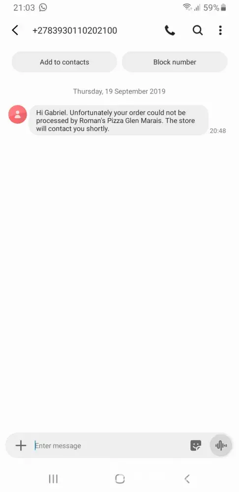 I placed an order with Romans Pizza Glen Marais at 20h48 tonight. Received a sms the my order has been cancelled. I was waiting for a call from the store but no response. I phoned the store abd they said that they cannot process my order as the store is already closed.