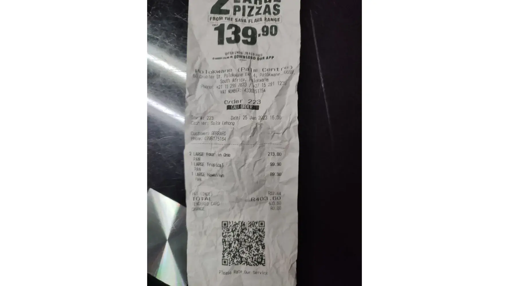 As I am single , today 9 / 04 / 2023 , I did not feel like cooking, and decided to get pizza, I went to the Rietfontein branch and order and paid for the pizza , then a gentleman and his come in after me after 5 min and placed an order. i was standing outside and having a smoke . To my suprize the got their pizza s before me .i waited another couple of minutes , still no pizza , when I told that i wanted my money back and that I did not want the pizza anymore , because of what had happened . I had to hear that the pizza s where ordered by phone , where as I saw them place and pay for the pizza , oh they had ordered two large pizza s ,And I had to wait because I ordered a small