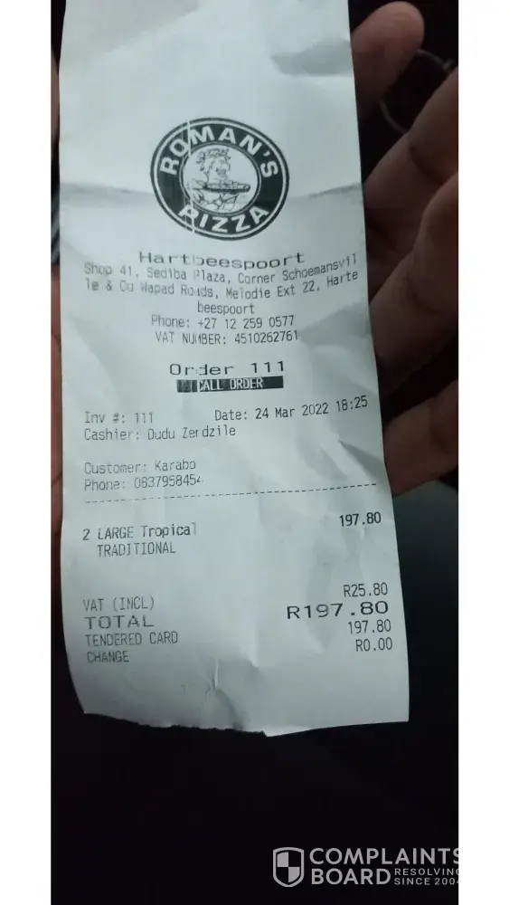 This was my first terrible experience with Romans Pizza Newlands, a place I had ordered from many times in the past.