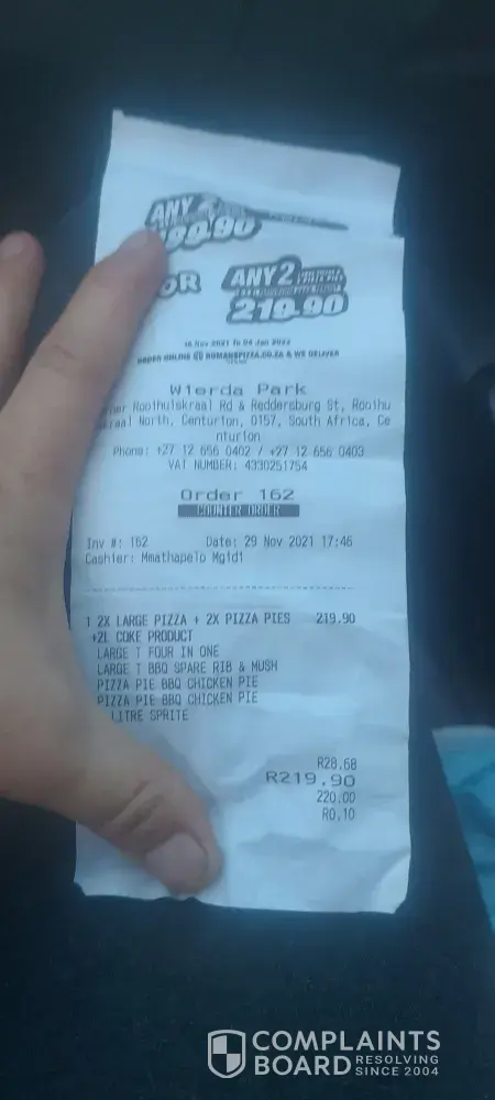 On Saturday, the 30th October 2021, at 16H19, my wife placed an order for 3 large pizzas, at Romanz pizza, shop 15 Garden Centre, 659 Van Der Hoff road, Pretoria Gardens, 0082, South Africa.