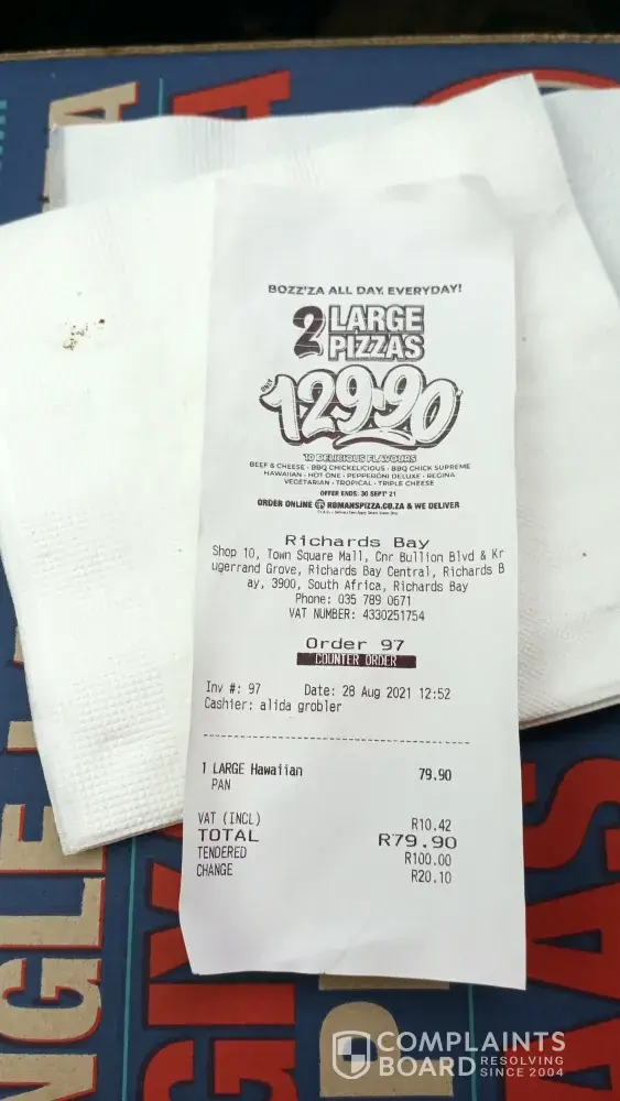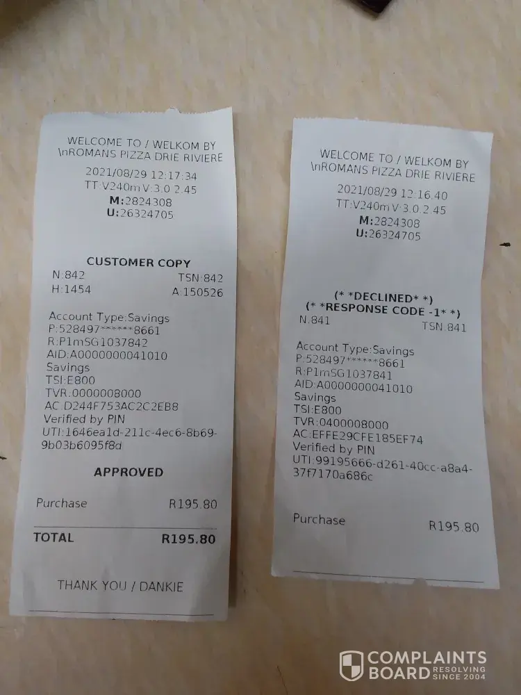 29-08-2021 I went to Romans pizza in Drie Riviere and ordered 2 pizzas, and I paid with a card. After it got swiped the first time it got declined, so the lady assisting me made me swipe again and then it got approved. When I got home my capitec app stated that Romans pizza charged me twice for the same product. Some assistance would be appreciated.