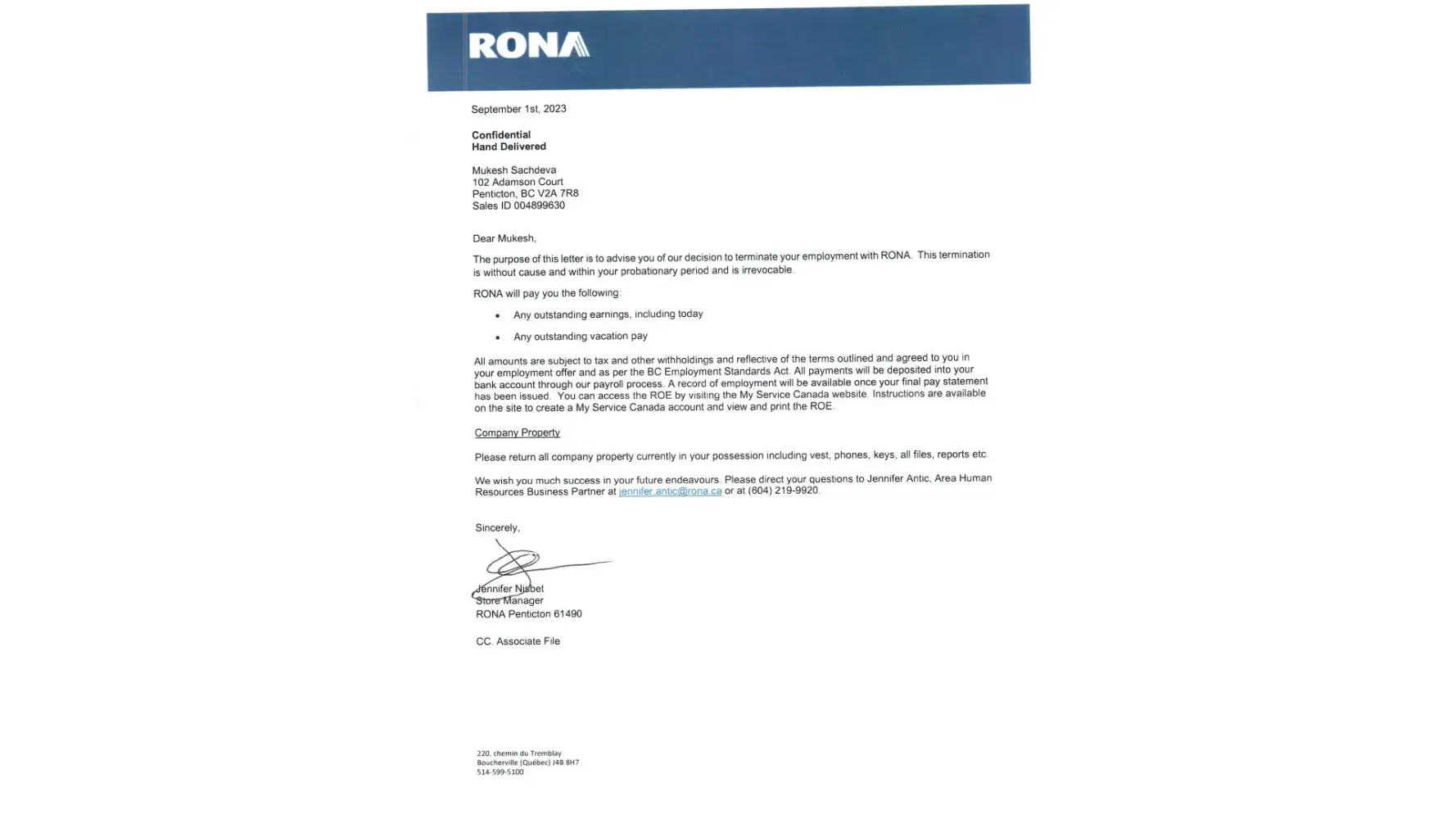 I was terminated by Miss Calli my manager. On Thursday 31Aug 2023 I was not felling well due to my Stomach infection and I was already informed to Assistant Store Manger Mr Waleed about my sick call. I feel this may be the reason. I was let go. It feels very shameful to be to be let go it this manner as it was my first job and I enjoyed working for Rona. The Store Manager Jennifer Nisbet is not Present at the time of Termination letter which is given to me but the letter having sign of Jenifer Nisbet { Store Manager }which is Signed by Mr Jordan in my presence. My name is Mukesh Sachdeva and my Email Address is mns.[protected]@gmail.com. my home address is 102 Adamson Court Penticton BC V2A 7R8