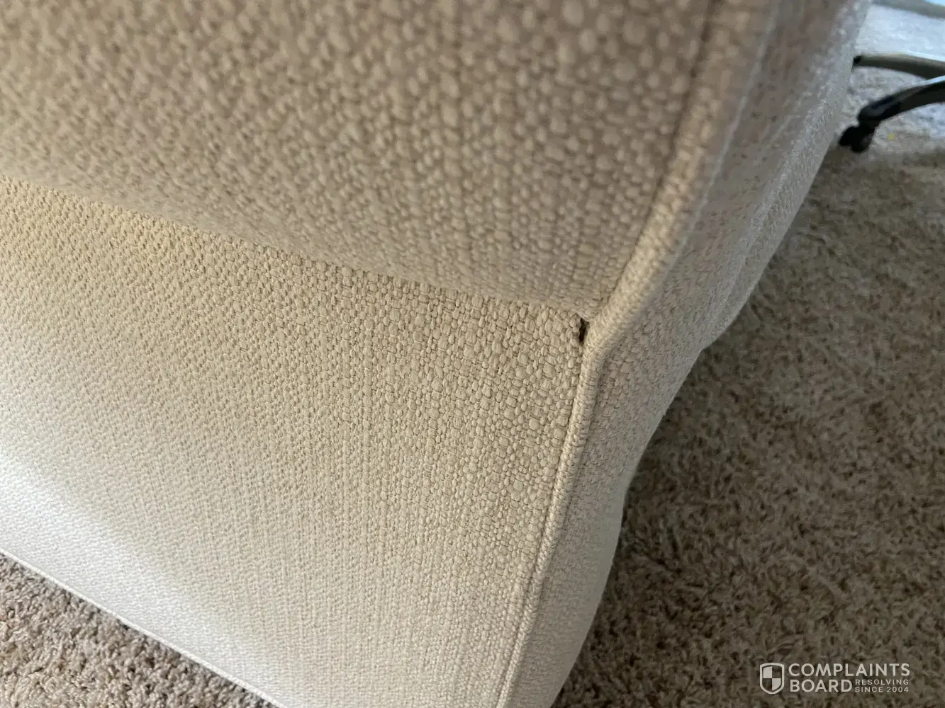 Terrible construction. They sent two reps out told me puckering of a very large seam would go away with wear! Padding bunched up on arms and a side seam open. Techs took pics. Said corporate office would call in two days. No one ever called. Resolve this issue! This is totally unacceptable and I am sharing my nightmare with everyone I speak to. This will be the last piece of furniture I ever buy at rooms to go and prepared to take legal action if necessary. R Vandevander