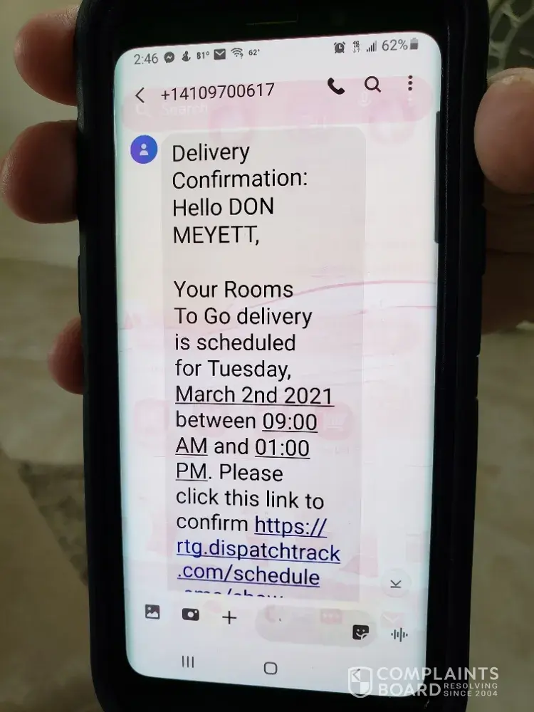 Delivery guy sent message to let me know that delivery of the sofa is between 2-6 March 17 the 2021 after I called rooms to go they tell me after 10 PM.