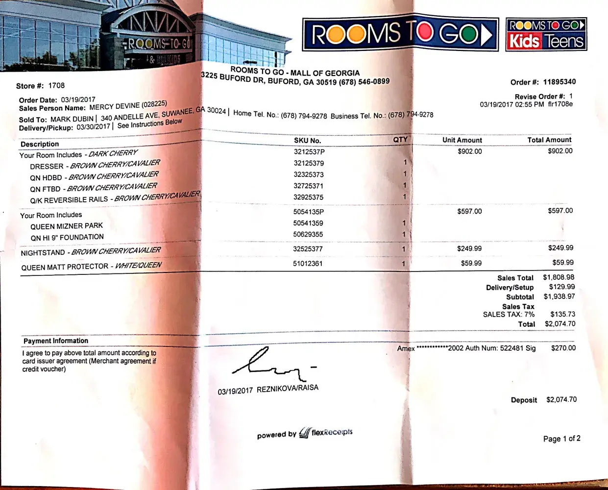 On February 2nd my wife and I visited your Rooms To Go in Raleigh, NC looking for a couch and loveseat that were electric. My wife got spoiled at her parents house and wanted to make sure we had that feature.
