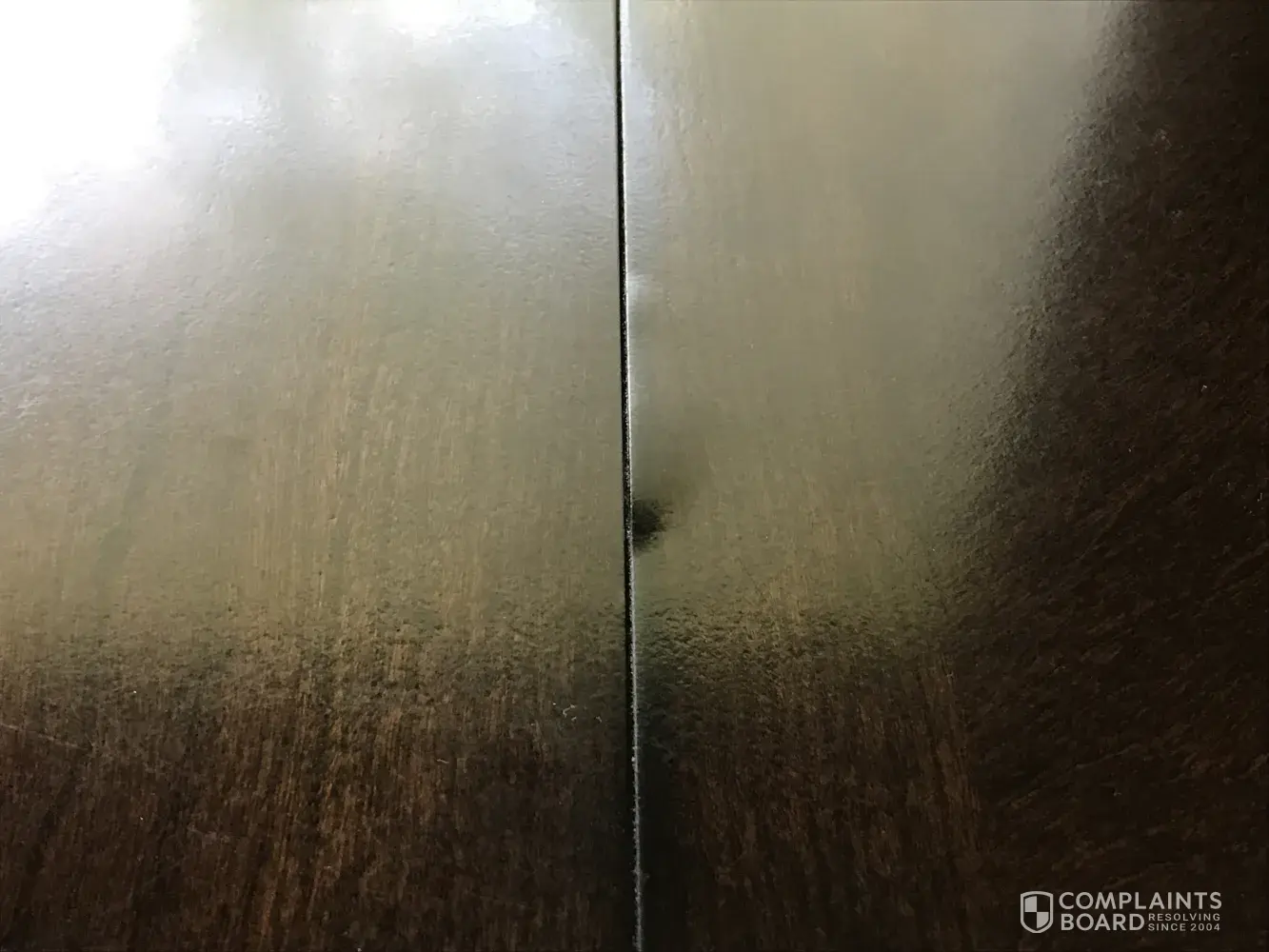We purchased the cabinet on July 28th, 2017 with an expected delivery date of August 9th, 2017. When our new cabinet arrived it looked terrible. The wood was dirty, the glass was filthy and had dried water droplets inside. The base of the cabinet had a piece missing exposing raw wood, two of the legs looked as though they had been sanded down, the area above the doors had several dents and the doors did not line up when shut. We pointed these issues out to the delivery driver who told us to call the 800 number and request a technician because there was nothing he could do about it. We called the 800 number as instructed and were told that it could not be fixed because of the exposed wood and that a replacement would have to be sent out. We arranged to have the replacement cabinet delivered on August 18th, 2017 between 10am -2pm.