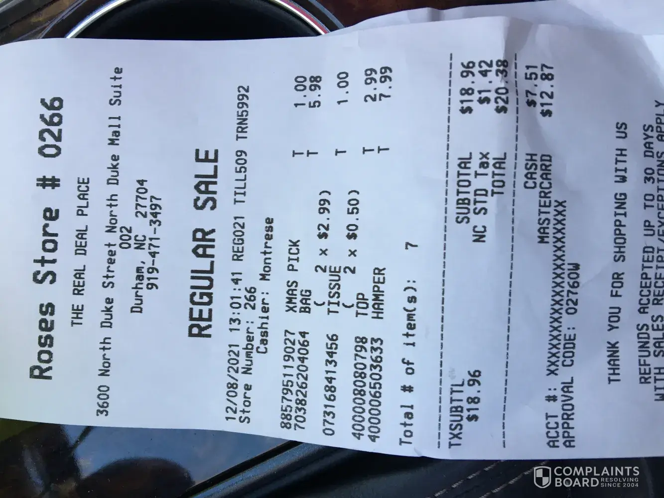 I was in the Roses store #0266 at approximately 13:01:41.. I went through the customer service land because I had to return an item and I had list my receipt. I had been told by another cashier I could do an exchange but couldn't get any money back, which was fine. I approached the cashier- Montrese and told her I wanted to return the item I had with no receipt and just do exchange and that I knew I couldn't get my money back because of no receipt. Montrese turned the cashier next to her and inquire about the transaction, that lady advised I could do an exchange but no cash refund. Montrese rang up all my items and then told me my total purchase price. I knew it was wrong because it was extremely too high. I asked her if she deducted my return off? Montrese in a hostile manner said " you can't get cash back". I said I know but did you give me credit on my return? Once again very hostile she said " you can't get cash back". At that time the other cashier heard as people in the line did too. The other cashier came over to the register and made the transaction correctly, explaining to Montrese at the same time how to correct her mistake. Then in another rude manner Montrese said it's waiting on you just like it was the first time! Customer in line were looking at me and rolling their eyes at how Montrese was speaking to me. Then Montrese bagged my items and and threw them over to me. I picked up my items and I told Montrese "if she treats all her customers like me she needs to find another job"! Montrese spoke to abruptly " I'm a customer and a human being too". I then just turn and walked out the store. The police was in the store and he witnessed the behavior of Montrese the cashier, and he following me outside and he told me that I didn't have to take that kind of treatment. ( so you know it had to have been a bad scenic for the policeman to follow me out of this Roses store) So that brings me here. Montrese got me so upset i didn't tell her I was a senior to my discount off of 10 percent. I'm 64 years old and she didn't even go ahead and discount my receipt voluntarily.