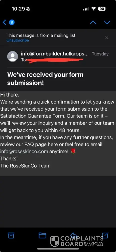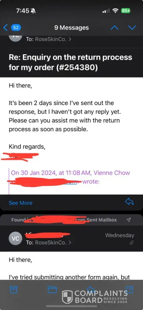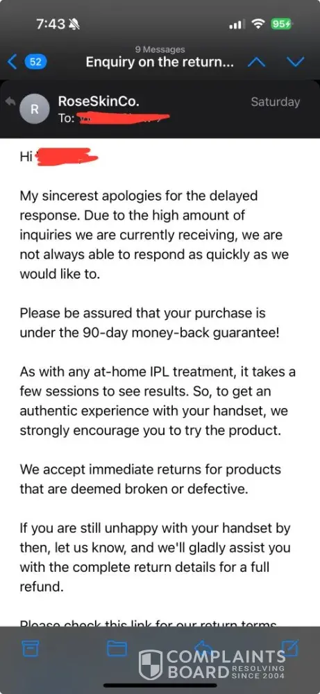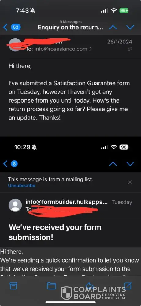 I ordered a Lumi handset from RoseSkinCo on 23 November 2023, it arrived on 4 December 2023. I would like to return the item under the 90-day return policy due to dissatisfaction on the product and filled in the Satisfaction Guarantee Form on 23 January 2024. Then I received a confirmation email of the form submission, with a message of “Our team is on it – we’ll review your inquiry and a member of our team will get back to you within 48 hours.â€. However, I’ve waited for 3 days but there’s still no response from them. So I sent an email to info@roseskinco.com to check out the status of my return process.
