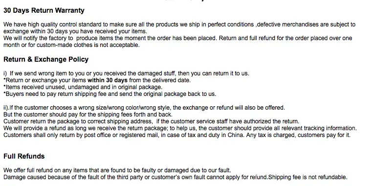 now paypal sees that my order has been shipped and to return it back to china would probably cost me as much as i paid for it. besides, i doubt they'll refund me anyway, since they're UNETHICAL~! now i'm trying to file another dispute because it is 'not as described'. unless you're a shopper who thinks that $20 dresses are a great buy, rather than you get the crap you paid for, DO NOT SUPPORT THIS TERRIBLE COMPANY.