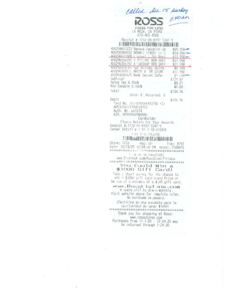 On 12/13/25 I went to LA MESA, CA Ross Store on a shopping tour, I was charged twice for the same item [protected] x wrkshop brn sher $ 21.99). I live in Ensenada Baja California México and once a year I shop there, I always shop in chula Vista California because it´s near the border...I called next day and a lady answered and told me that I needed to...