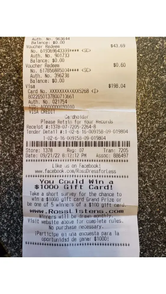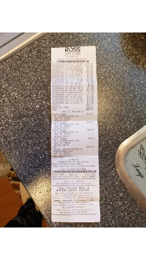 On December 8th, 2022, I purchased items totaling $90.38 from the Ross Department Store in Destin, Florida. Once I arrived home, I realized that one of the items was a swimming suit that I could not fit, and another was a small wired spice rack that was not found among my purchases.