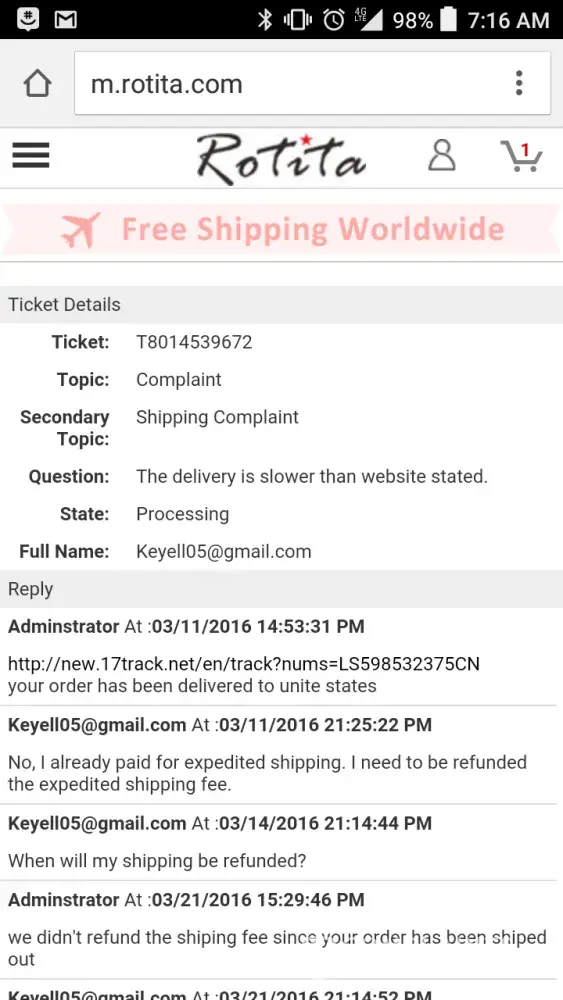 After submitting my first ticket to get the number Rotita must provide in order for you to return items, I never received a response. When I went to submit another ticket their site told me my email address was "bad". Now I seem to be stuck with clothes that are poor quality, not sewn together and don't fit.