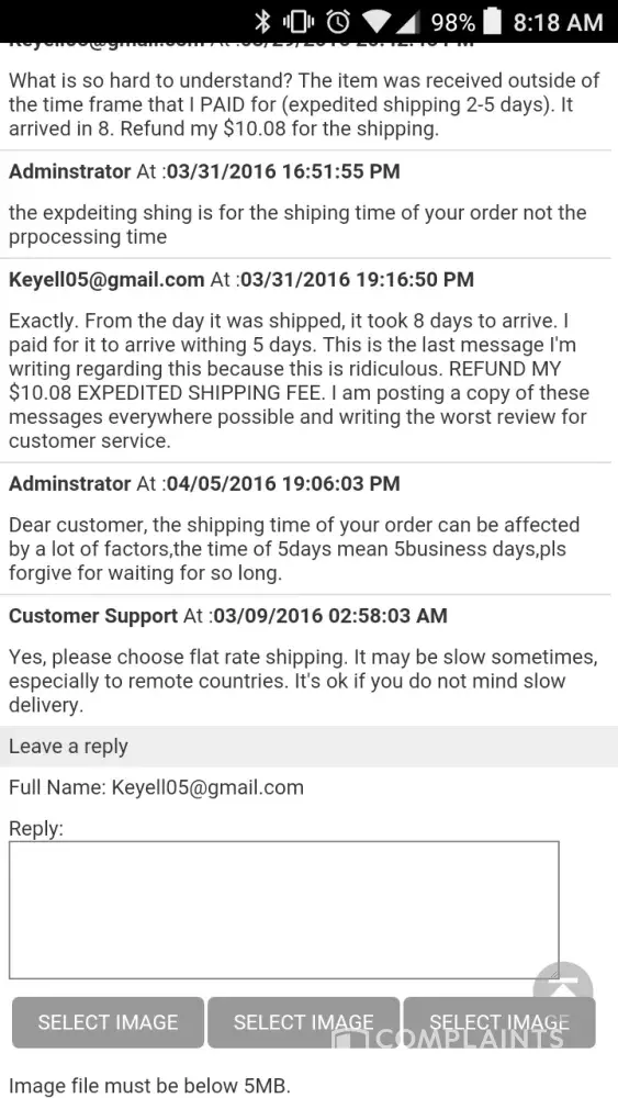 So, here it goes. Paid for expedited shipping: 2-5 days. Got it in 8 days. So, my shipping should be refunded. These idiots won't refund it and seem to be completely clueless as to why it should be refunded. Messaged them back and forth over a month about this issue. Do yourself a favor, order from another site.