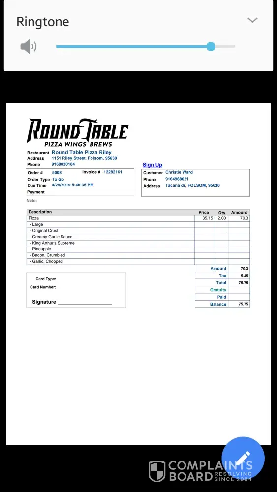 Round Table Pizza Customer service