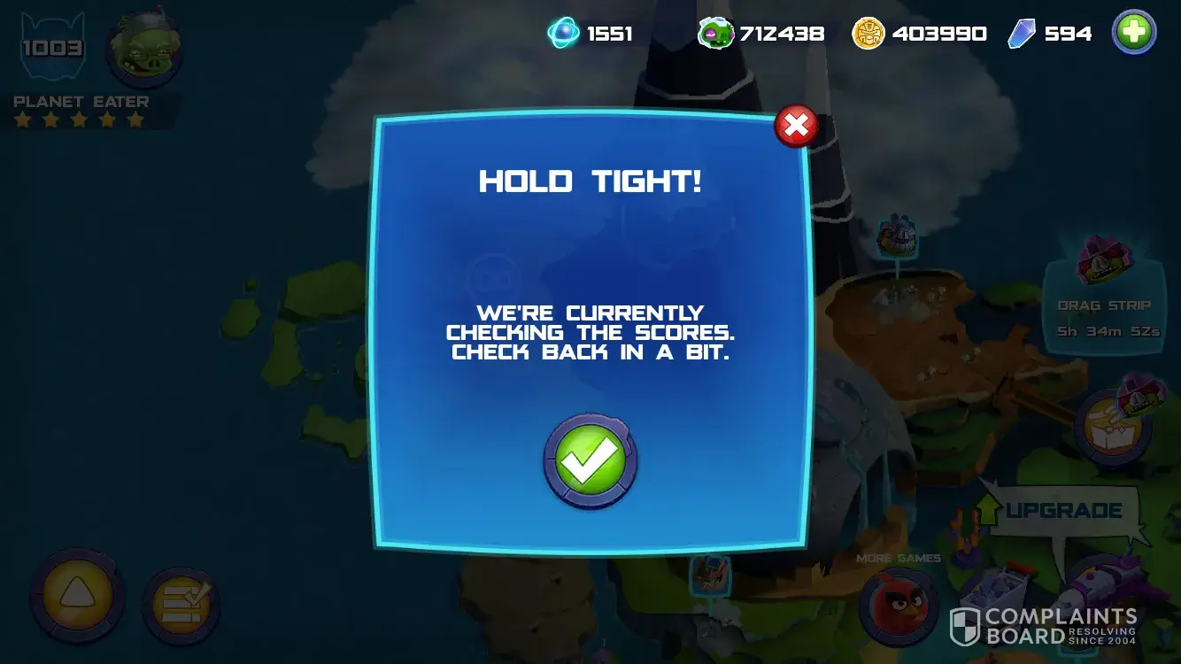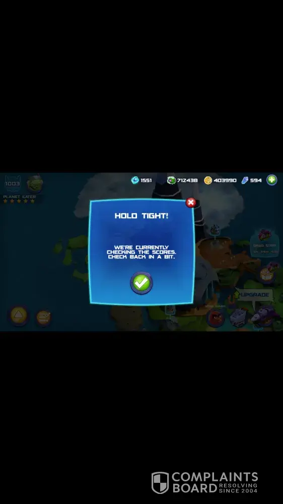 I purchased the devastator challenge run for 2500 gems and used approximately 1500 gems to obtain prizes. The game has been completed and malfunctioning for over 43 hours. There is no resolution for the game prizes we paid for and we earned. The devastator challenge run game is fraudulent and Rovio has horrible game play customer service. We want gem compensation!