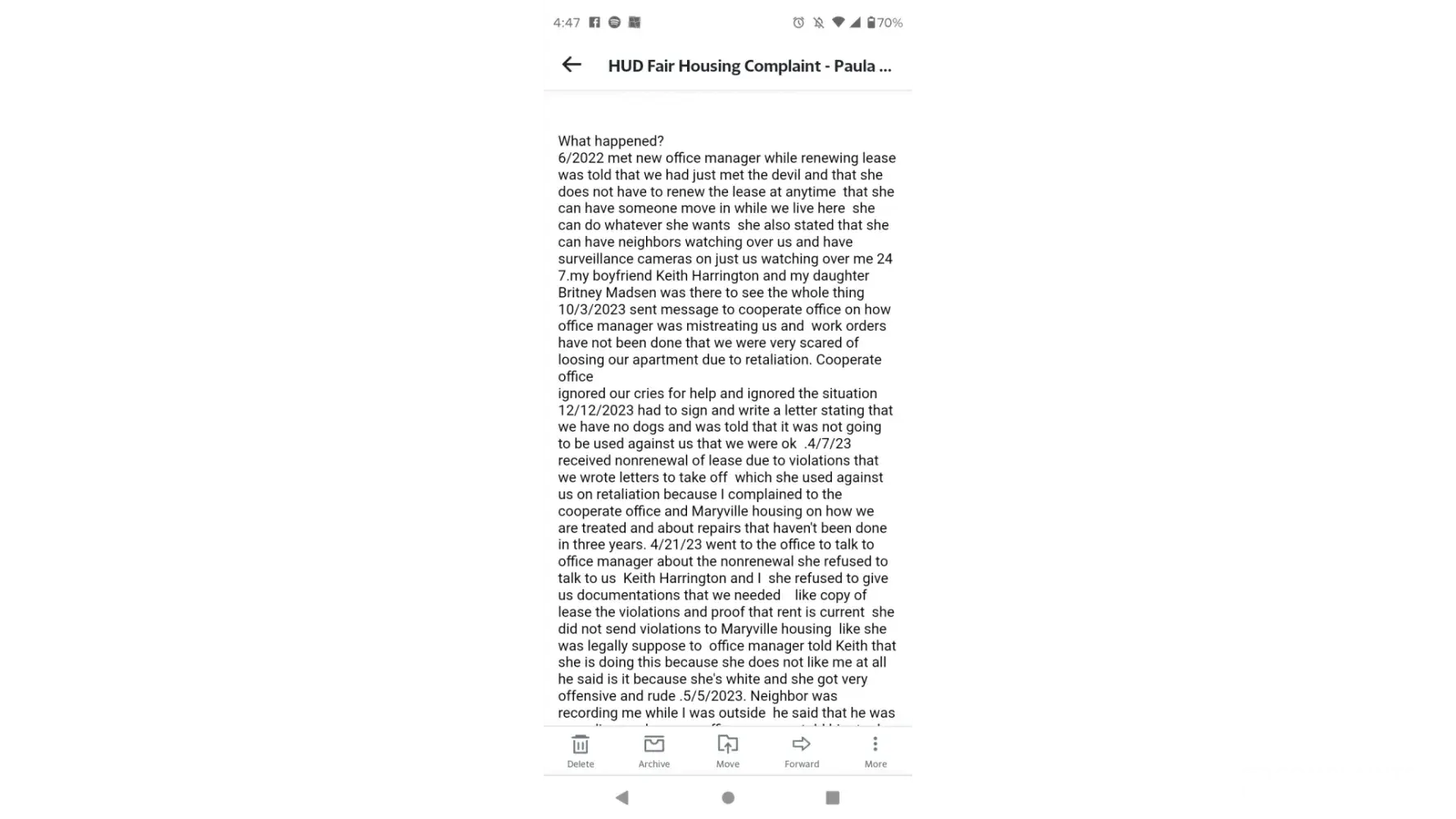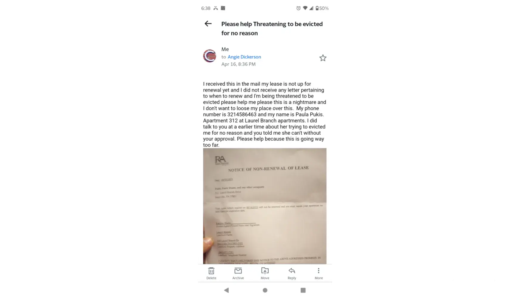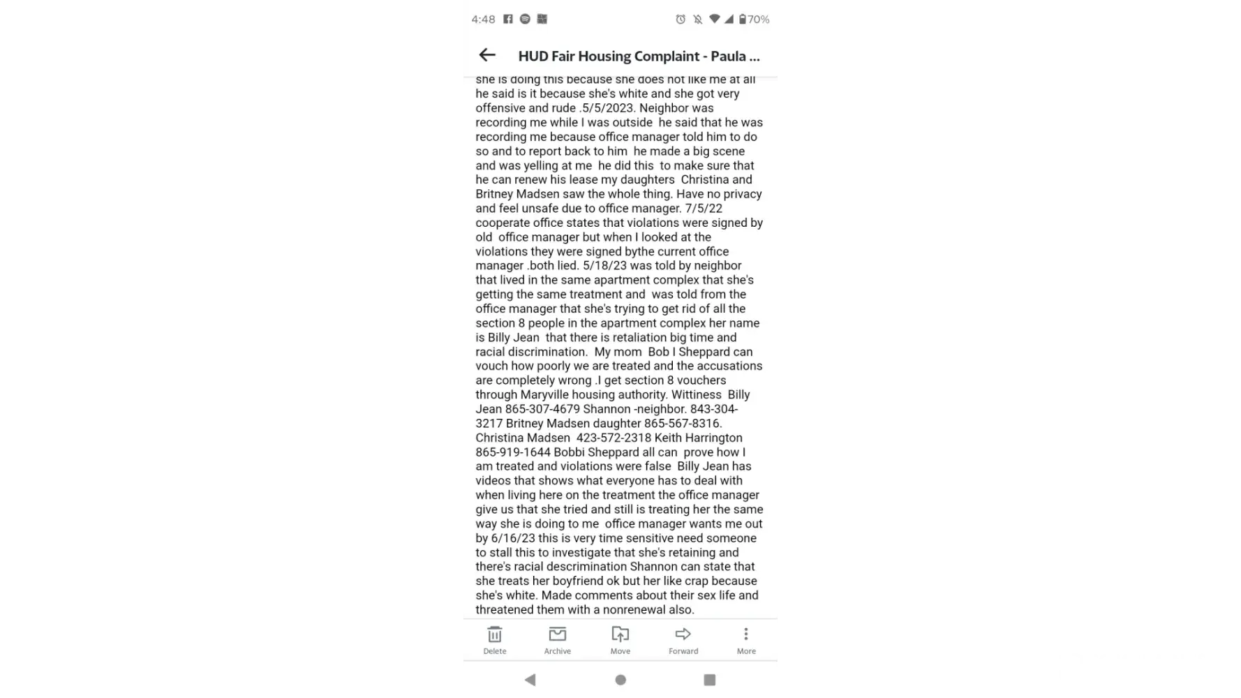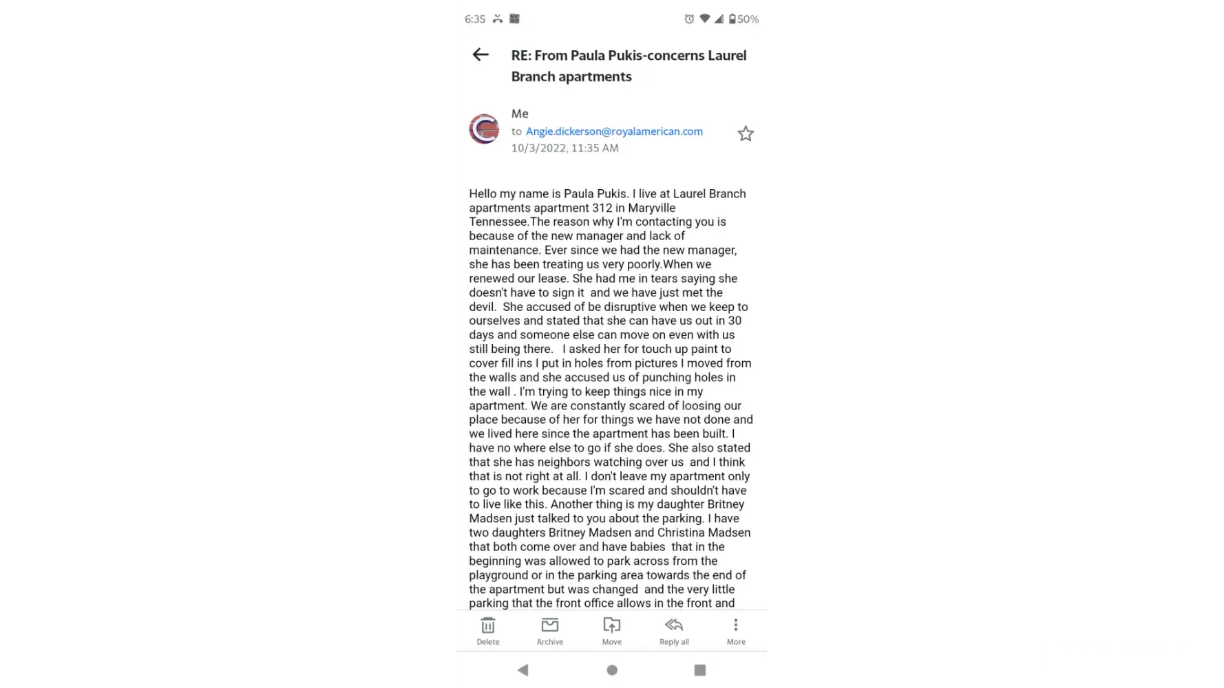 My name is Paula Pukis and I live with my boyfriend and two kids. I have lived at Laurel Branch Apartments in Maryville TN since 6/2019 I have never had any problems until we got this new manager Katrina hicks into our office. I met her when I renewed my lease last year she said we just met the devil and she can do a nonrenewal at anytime and she can have neighbors watching us and surveillance put on us watching us 24 7 I contacted Angie from cooperate office to complain about treatment from office and that repairs have not been done in my apartment for years and have been ignored my complaint and fear of retaliation was completely ignored. So I contacted Maryville housing authority since I'm on section 8 vouchers and complained about what's going on after that the office manager has been retaliating against me she sent me a nonrenewal letter and used violations against me that were founded false that I had to write letters and signed Katrina said that we were ok and not to worry but she is using them against us and Angie believes her even when I have proof Katrina told my boyfriend that she's doing this eviction because she doesn't like me and got very angry and verbal when asked because I'm white she had my next door neighbor record me while I was outside and he told me he did this because she told him to do it and report back to her. Another neighbor I spoke to has videos on how bad she treats her tenants which is very rude and discriminating was told she's getting rid of section 8 people for no reason she accused her of not needing a medical animal because she has no disability and tried evicting her neighbor near me was also threatened with nonrenewal and talked to her inappropriately about her sex life with her husband will talk to her husband but won't talk to her because she's white she puts the fear of God in us and we are scared to loose the only place we have I was told I have till 6/16 to get out I have reported to fair housing, channel ten and 8 news ,senator Blackburn, the governor of Tennessee and the president of the United states .I'm trying to get legal aid to help me there's no other apartments available in my area and was told by a lawyer that lives in apartment 111 that Katrina has tons of violations on her that is not known and that there is racial discrimination towards whites and to contact the news station that what she's doing is very illegal all I am asking is for my lease to be renewed. I did contact BBB I don't want me and my children living in my car due to Katrina doing illegal acts and I have neighbors and proof to what she is doing. Angie states they have a lawyer and they are making me out to be the threat to my neighbors when two neighbors are spying for Katrina. Please help me stop this nonrenewal she will do this to others and is I don't want to be a victim to her I want to keep my place