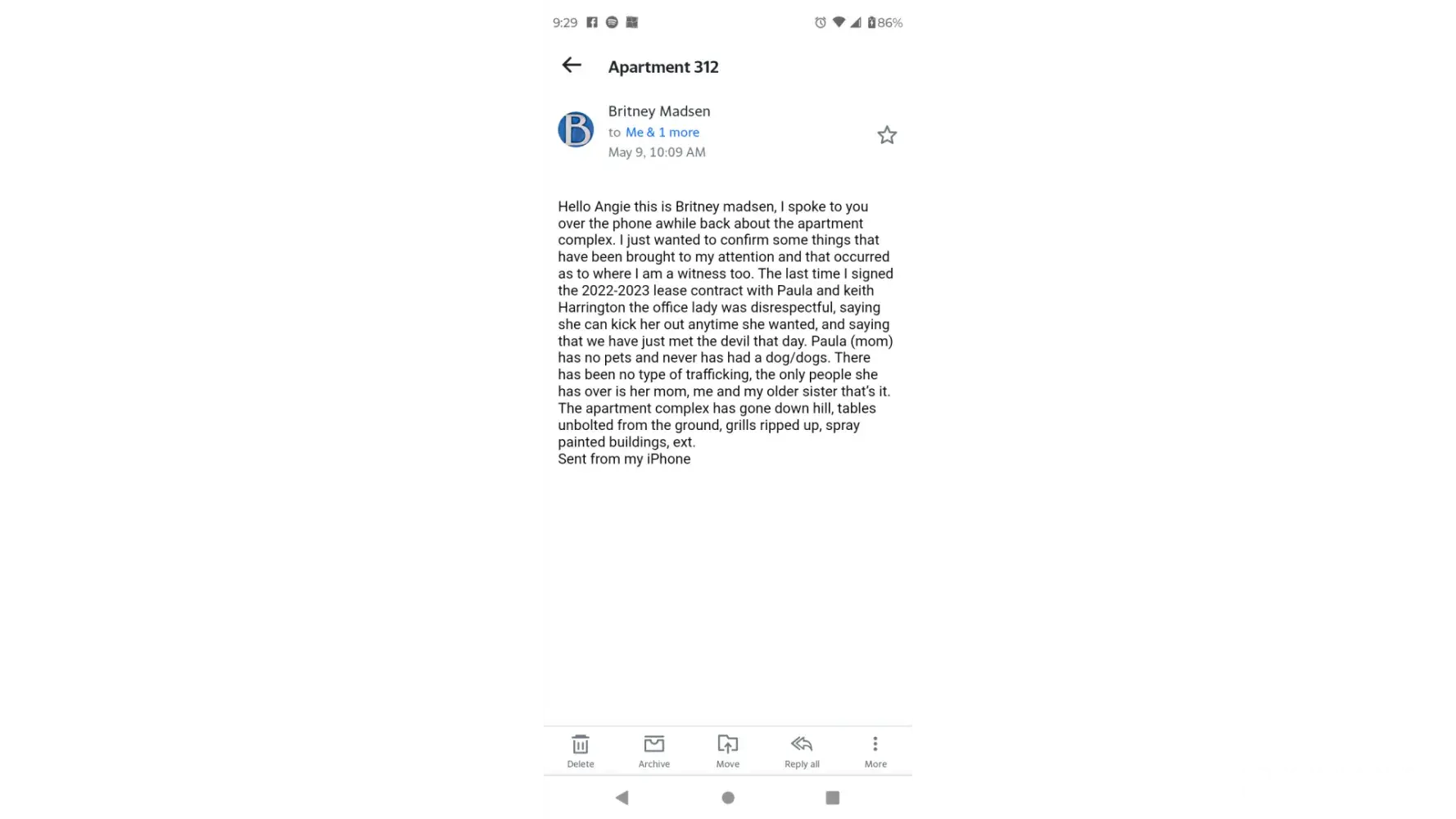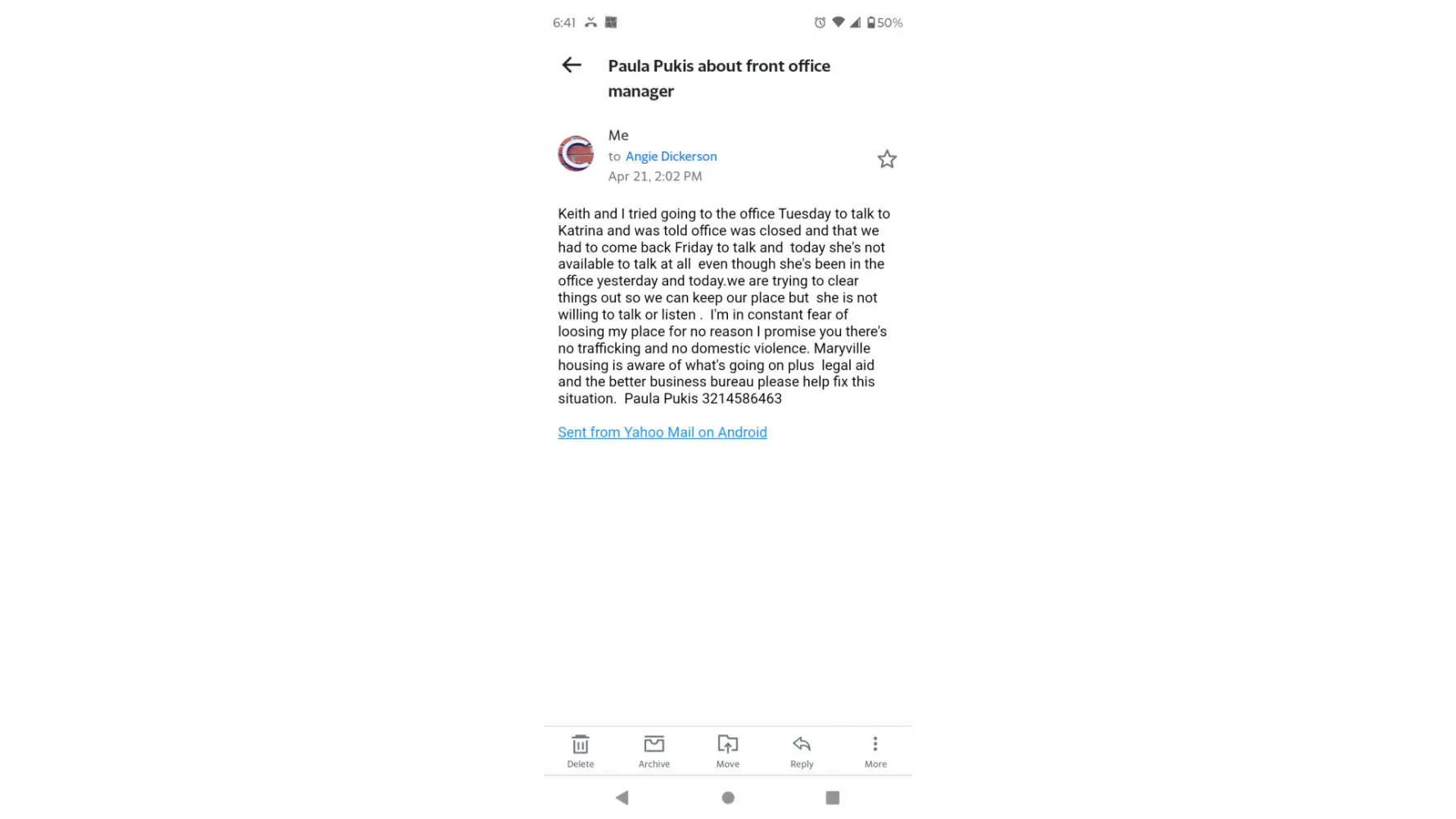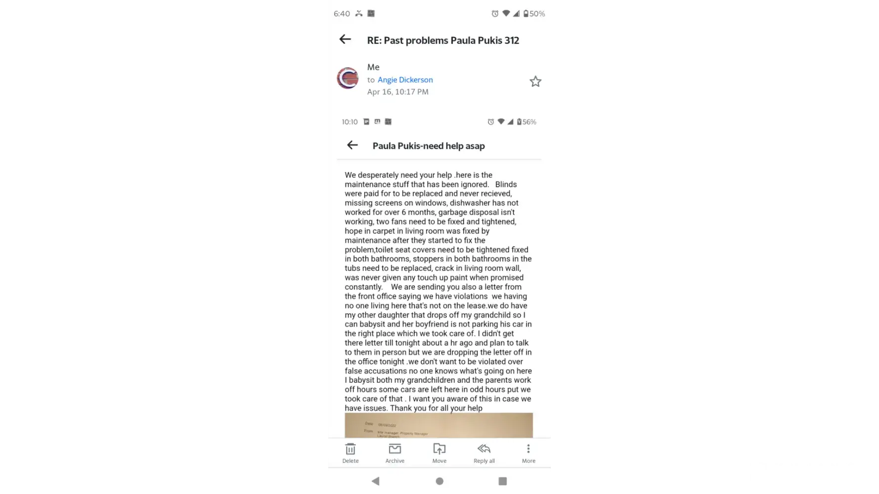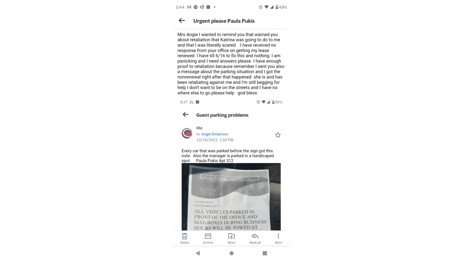 My name is Paula Pukis and I live with my boyfriend and two kids. I have lived at Laurel Branch Apartments in Maryville TN since 6/2019 I have never had any problems until we got this new manager Katrina hicks into our office. I met her when I renewed my lease last year she said we just met the devil and she can do a nonrenewal at anytime and she can have neighbors watching us and surveillance put on us watching us 24 7 I contacted Angie from cooperate office to complain about treatment from office and that repairs have not been done in my apartment for years and have been ignored my complaint and fear of retaliation was completely ignored. So I contacted Maryville housing authority since I'm on section 8 vouchers and complained about what's going on after that the office manager has been retaliating against me she sent me a nonrenewal letter and used violations against me that were founded false that I had to write letters and signed Katrina said that we were ok and not to worry but she is using them against us and Angie believes her even when I have proof Katrina told my boyfriend that she's doing this eviction because she doesn't like me and got very angry and verbal when asked because I'm white she had my next door neighbor record me while I was outside and he told me he did this because she told him to do it and report back to her. Another neighbor I spoke to has videos on how bad she treats her tenants which is very rude and discriminating was told she's getting rid of section 8 people for no reason she accused her of not needing a medical animal because she has no disability and tried evicting her neighbor near me was also threatened with nonrenewal and talked to her inappropriately about her sex life with her husband will talk to her husband but won't talk to her because she's white she puts the fear of God in us and we are scared to loose the only place we have I was told I have till 6/16 to get out I have reported to fair housing, channel ten and 8 news ,senator Blackburn, the governor of Tennessee and the president of the United states .I'm trying to get legal aid to help me there's no other apartments available in my area and was told by a lawyer that lives in apartment 111 that Katrina has tons of violations on her that is not known and that there is racial discrimination towards whites and to contact the news station that what she's doing is very illegal all I am asking is for my lease to be renewed. I did contact BBB I don't want me and my children living in my car due to Katrina doing illegal acts and I have neighbors and proof to what she is doing. Angie states they have a lawyer and they are making me out to be the threat to my neighbors when two neighbors are spying for Katrina. Please help me stop this nonrenewal she will do this to others and is I don't want to be a victim to her I want to keep my place