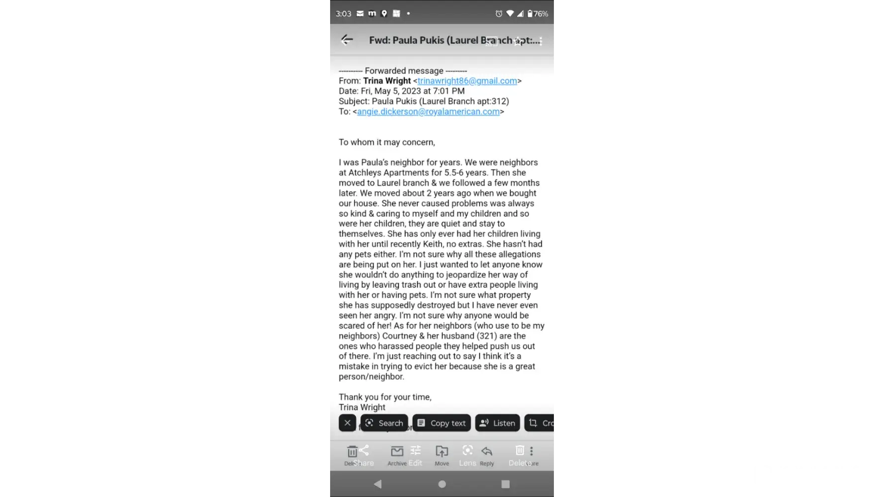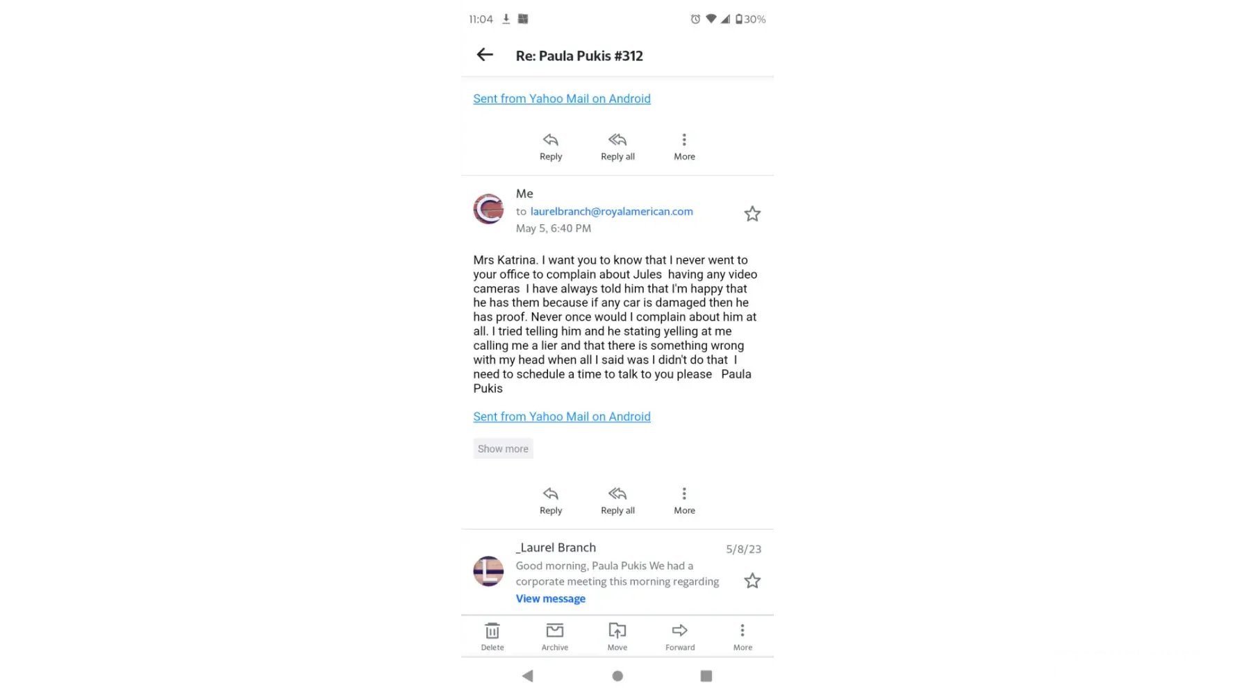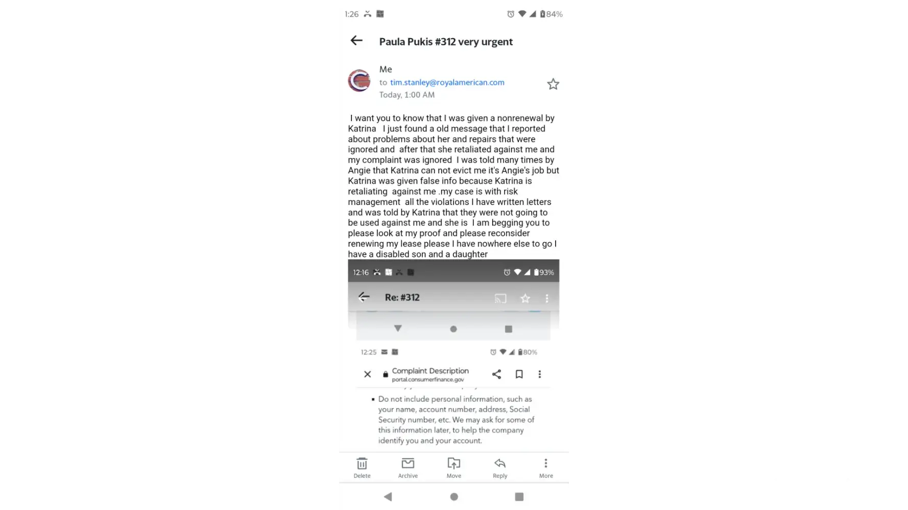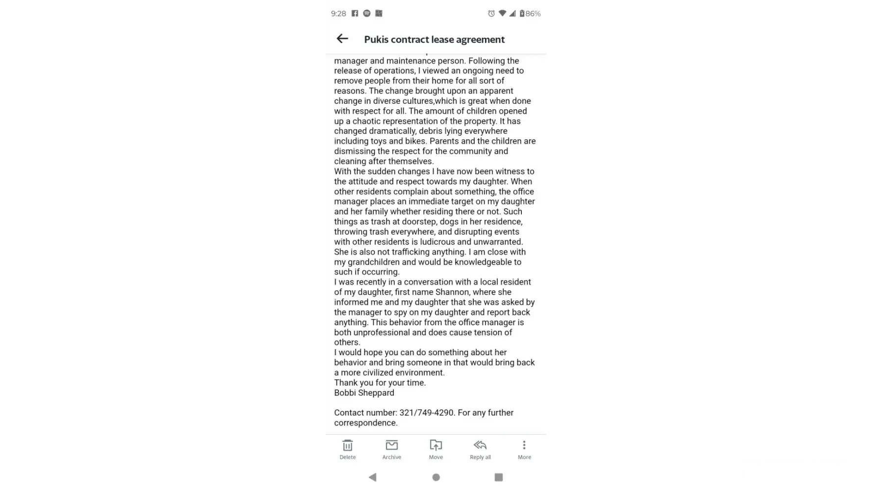 My name is Paula Pukis and I live with my boyfriend and two kids. I have lived at Laurel Branch Apartments in Maryville TN since 6/2019 I have never had any problems until we got this new manager Katrina hicks into our office. I met her when I renewed my lease last year she said we just met the devil and she can do a nonrenewal at anytime and she can have neighbors watching us and surveillance put on us watching us 24 7 I contacted Angie from cooperate office to complain about treatment from office and that repairs have not been done in my apartment for years and have been ignored my complaint and fear of retaliation was completely ignored. So I contacted Maryville housing authority since I'm on section 8 vouchers and complained about what's going on after that the office manager has been retaliating against me she sent me a nonrenewal letter and used violations against me that were founded false that I had to write letters and signed Katrina said that we were ok and not to worry but she is using them against us and Angie believes her even when I have proof Katrina told my boyfriend that she's doing this eviction because she doesn't like me and got very angry and verbal when asked because I'm white she had my next door neighbor record me while I was outside and he told me he did this because she told him to do it and report back to her. Another neighbor I spoke to has videos on how bad she treats her tenants which is very rude and discriminating was told she's getting rid of section 8 people for no reason she accused her of not needing a medical animal because she has no disability and tried evicting her neighbor near me was also threatened with nonrenewal and talked to her inappropriately about her sex life with her husband will talk to her husband but won't talk to her because she's white she puts the fear of God in us and we are scared to loose the only place we have I was told I have till 6/16 to get out I have reported to fair housing, channel ten and 8 news ,senator Blackburn, the governor of Tennessee and the president of the United states .I'm trying to get legal aid to help me there's no other apartments available in my area and was told by a lawyer that lives in apartment 111 that Katrina has tons of violations on her that is not known and that there is racial discrimination towards whites and to contact the news station that what she's doing is very illegal all I am asking is for my lease to be renewed. I did contact BBB I don't want me and my children living in my car due to Katrina doing illegal acts and I have neighbors and proof to what she is doing. Angie states they have a lawyer and they are making me out to be the threat to my neighbors when two neighbors are spying for Katrina. Please help me stop this nonrenewal she will do this to others and is I don't want to be a victim to her I want to keep my place