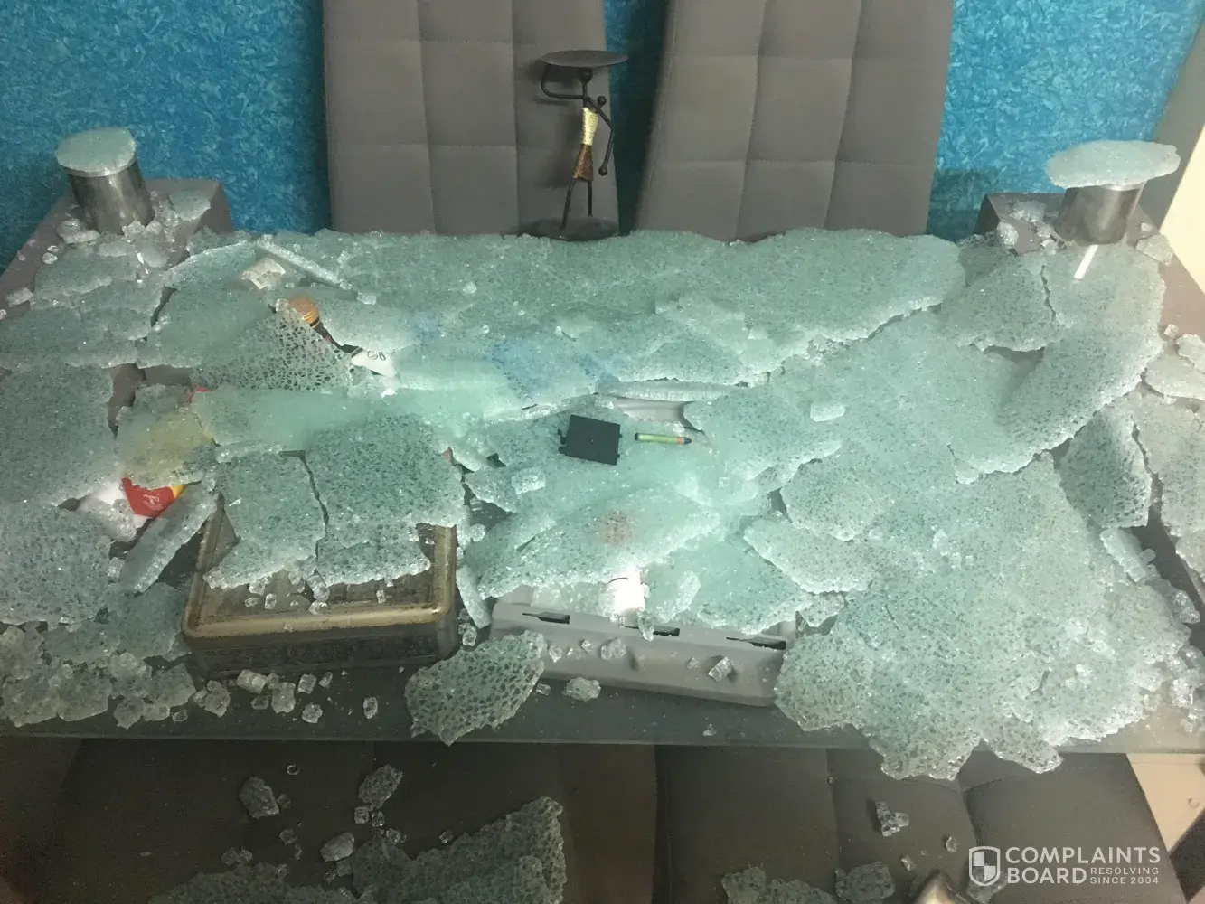 This has reference to the dining table purchased from your Banaswasdi store on 07/11/2014 in the name of Shikha Prasad order no:[protected]. The table had a glass top. The glass on the table suddenly broke off(almost blasted ) into pieces with a loud noise .The glass pieces were scattered all around the house which could have caused a serious injury.