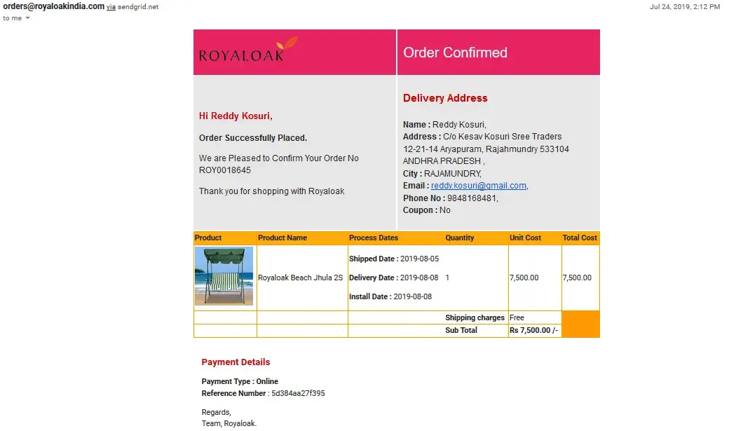 This is to inform you that, on July 5th I have placed an online order for couple of below products from Royal Oak website associated with the Order No: ROY0048884: