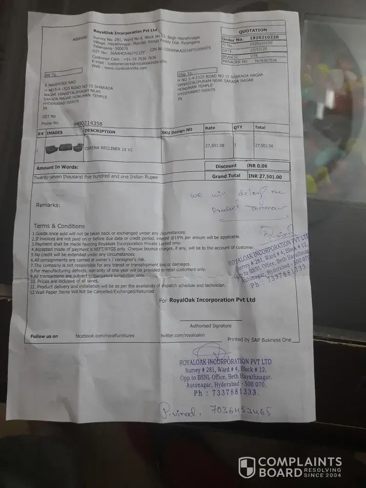I had a terrible experience with RoyalOak and I want others to avoid the same trap. I bought a sofa for 30k, and when the delivery team arrived, they simply said it couldn’t be taken through the staircase. They didn’t even bother to check or attempt roof delivery, which every other furniture company at least considers. The worst part? They told me the...