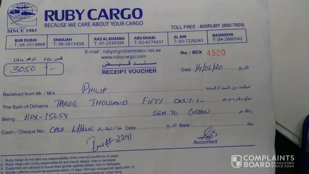 I would like to file a complaint for ruby cargo which operating here in dubai and abu dhabi, because you don't have your own warehouse, forwarder and agent directly to philippines and not paying properly the sub-company you are using in philippines, they hold the shipment for more than 60 days that causes too much delay. First of all you get from your customer cash payment and not process our shipment on time because you're using our money to your benefits only.! please correct your business ethics. How can you get trust from people.