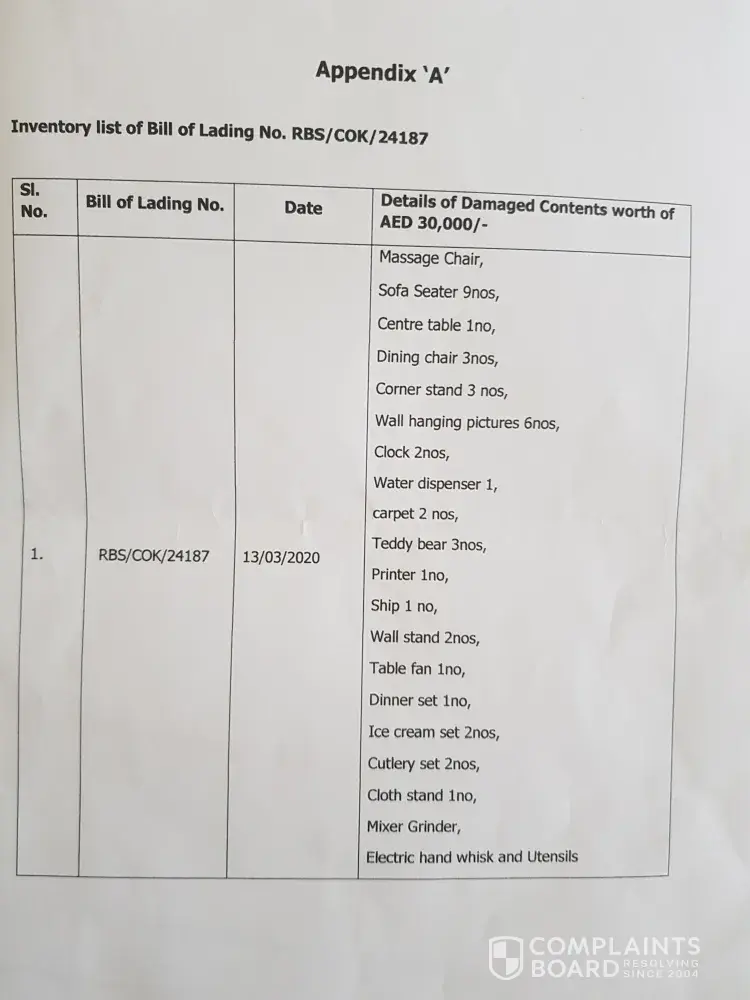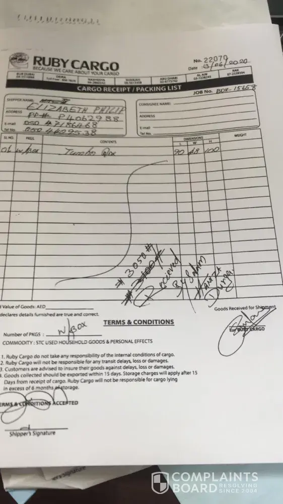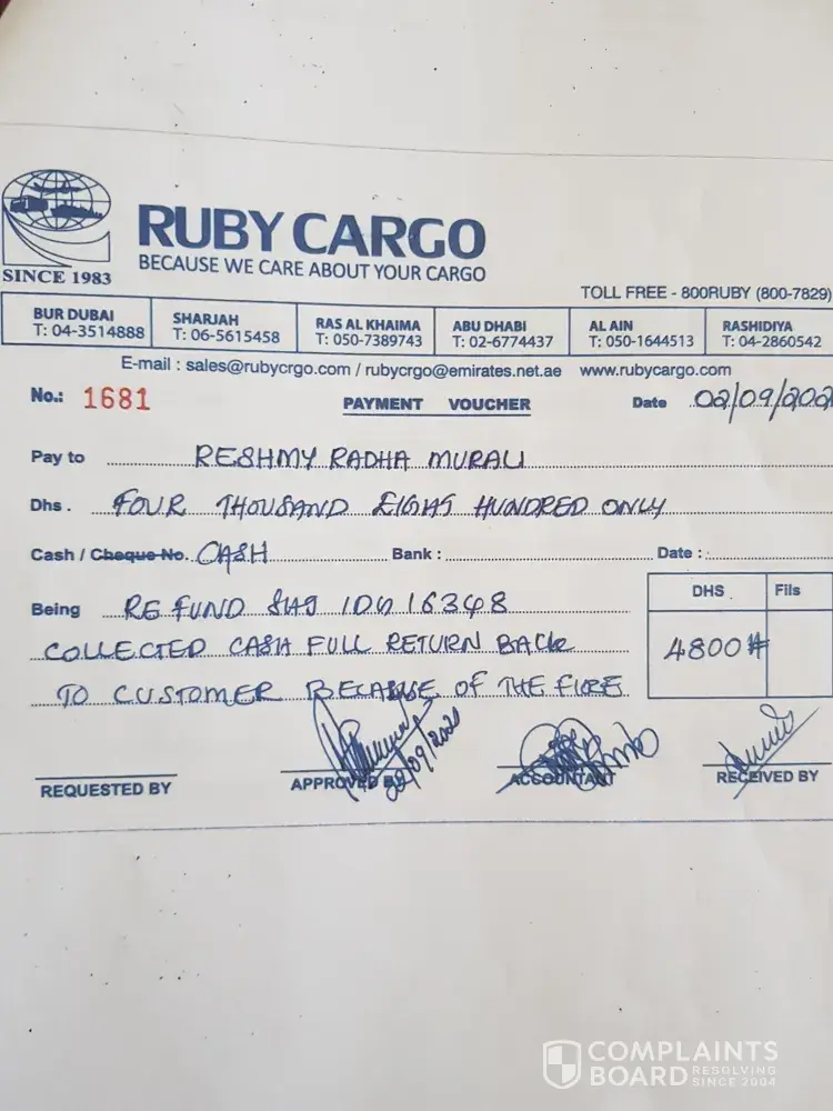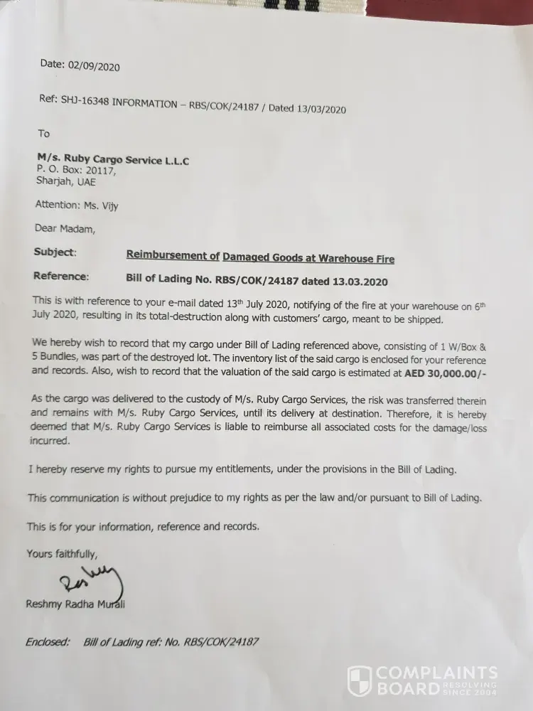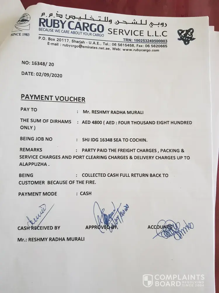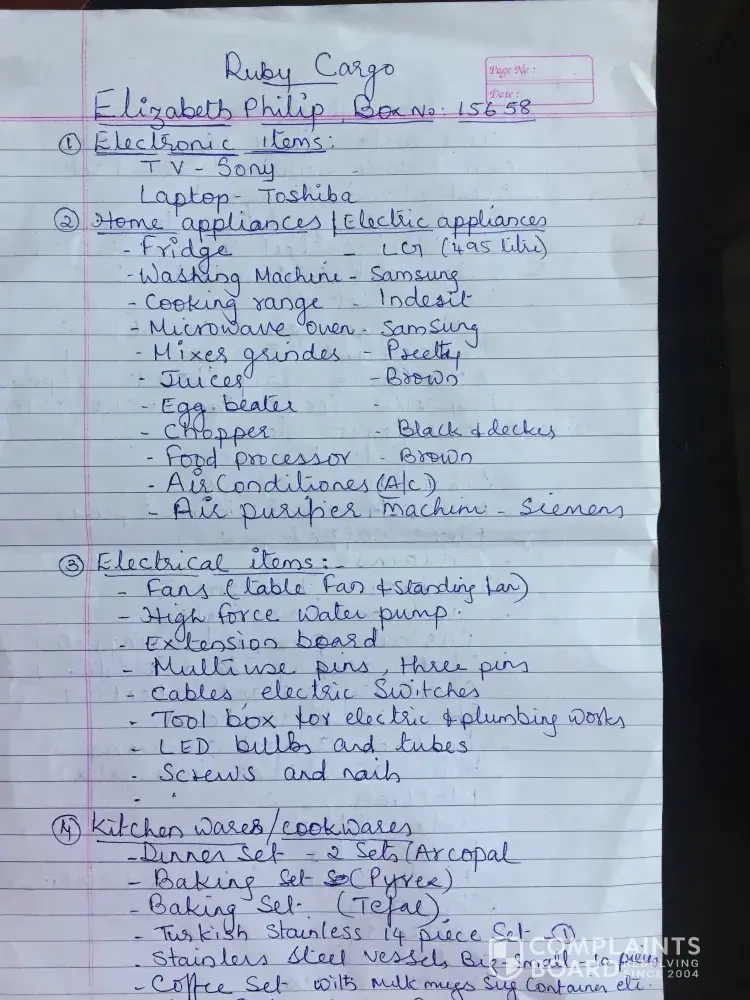 This is Elizabeth Philip, writing this mail with lots of tears.. I was a resident of Dubai for the last 18 years and was working as a nurse in DHA. I was a front line covid fighter.. Due to some unavoidable circumstances I had to leave my job (there was no one to look after my 91 year old mother who was bedridden after a fall. While leaving Dubai we booked a jumbo box cargo items job No 15658 with Ruby cargo LLc and paid the shipment charges. In that jumbo box my 18 years of hard earnings was there and with great hope I traveled to Indi on June 28th... cargo items were taken from my home on June 13 th and I asked them to do the shipment at the earliest. how ever they delayed the shipment without any information and reason and on 13 th July I received a mail from him that they had fire at their ware house on 6 th July and there is total loss of all items.