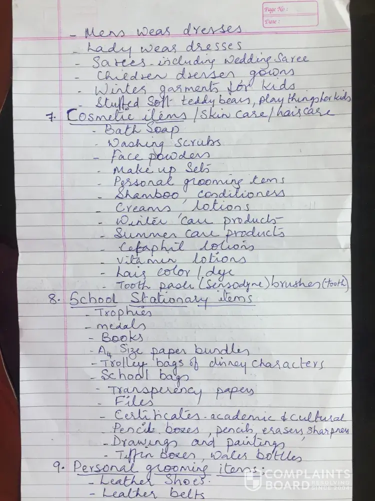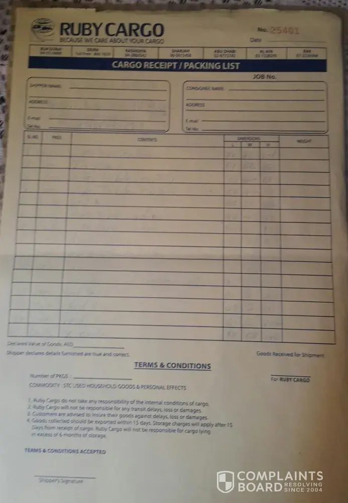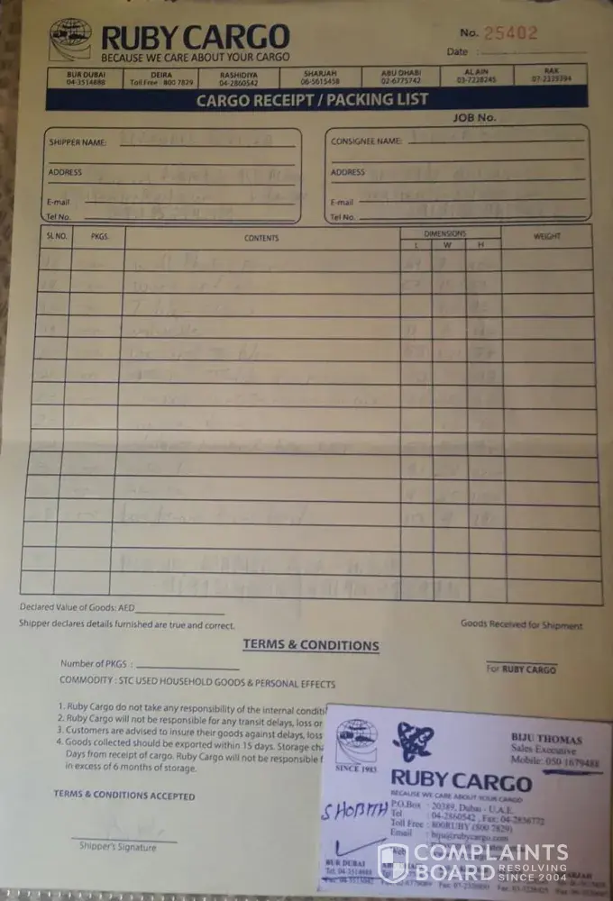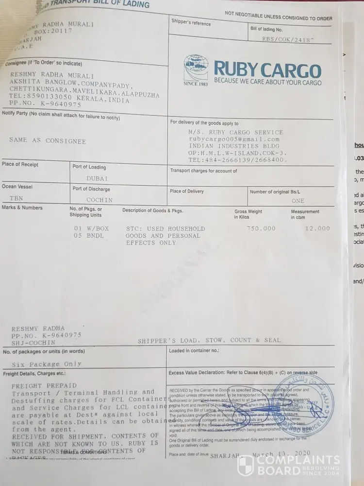 Sir, that box is my hard earnings and all of my end of service benefit which I spent for purchasing the items thinking I could settle back peacefully in India... All my child's academic certificates, trophies and medals everything which money could not buy back was also there in the box.. how ever after lot of arguement Ruby cargo refunded the shipment charge which I gave them but for the compensation they are keeping quiet. They don't answer the phone or mails. Now I don't have anything with me not even our dress items Sir please have mercy and kindly help to get the compensation.. attached here with the documents and the packing list for your review.. I also lost all my sweet memories of 18 years of life in Dubai which was stored in laptop and hard risk.