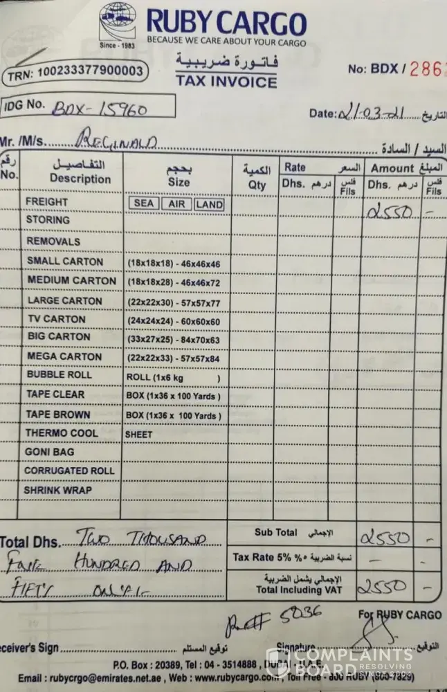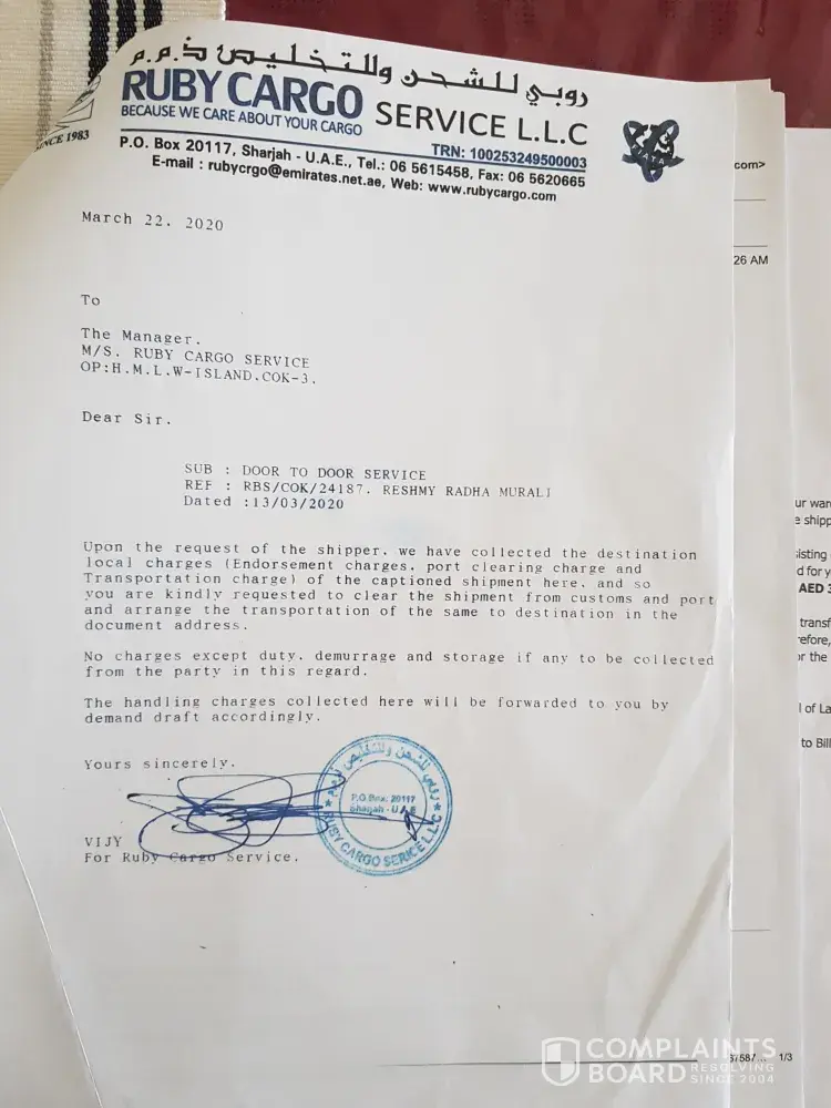 I am the last victim by Ruby cargo. I was relocating to UK and ruby cargo sent all my stuffs to UK. After a long chase its reached here in UK but the local agent asked me to pay 565 pound extra for delivery and 180 for the transport. Ruby cargo said they will refund the money but it never happened. Its an internal agreement between ruby cargo and the local agent in other countries. Of course you will pay if you don't get your stuffs on time. Thats the idea of ruby cargo. I must say this is the worst service i ever seen. I made a complaint to consumer care(consumerrights.dubaided.gov.ae) in Dubai but they are worse than Ruby cargo. They replied me "someone" will contact me soon. Its has been 4 months now and that "someone" is not appeared yet. Guys, Don't ever go with this company. They are a group of IDIOTS and squeeze your money.