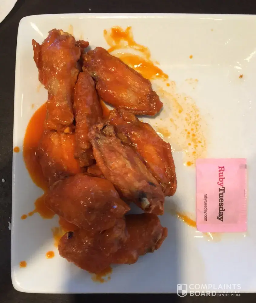 When I said something, the waiter looked at me like I was crazy. That's the way they are'. Oh yeah, then you enjoy them because I won't be coming back. My wife is 61 yrs young and 110lbs soaking wet. She eats like a bird and was still hungry after eating these wings. Which never happens at Ruby Tuesday(usually).