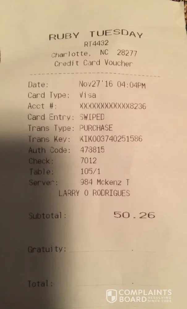 We went to RT on Nov 19th, 2016. Server was Clark R and the check #7833