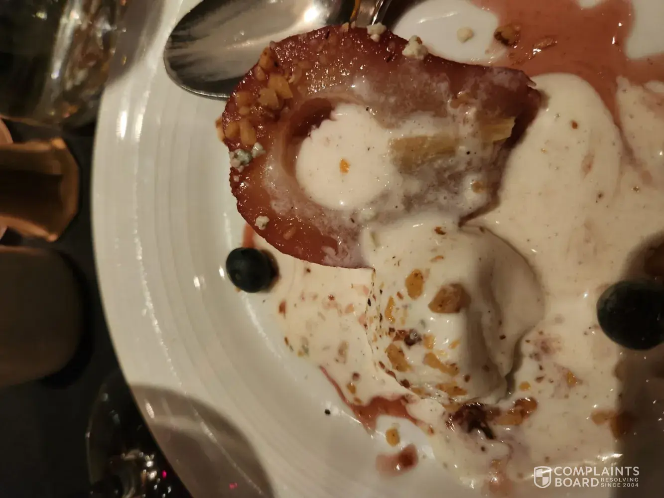 The dessert was a pear with ice cream in the middle, but when they served it it was already melted off the pear, and we then had to wait another 10 minutes to get a spoon to eat it, at which point it really was inedible, pic below.