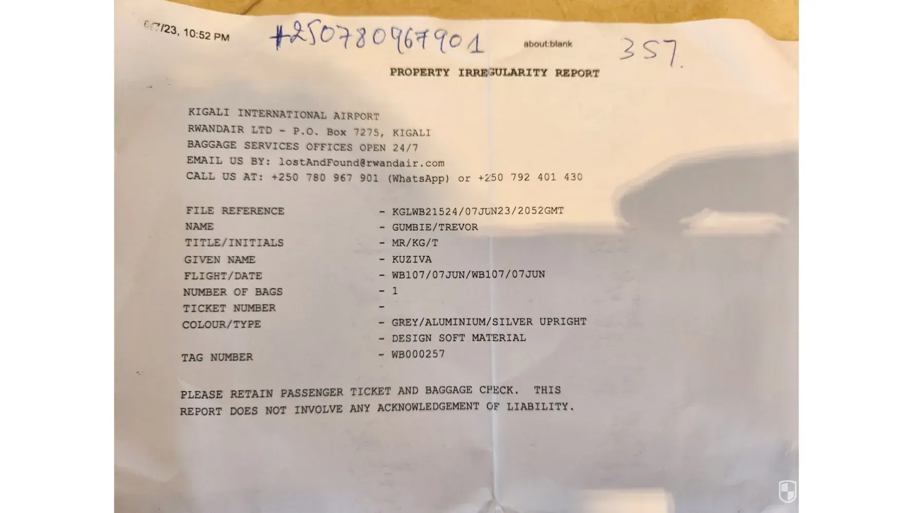 RwandAir bags lost - KGLWB21524/07JUN23/2052